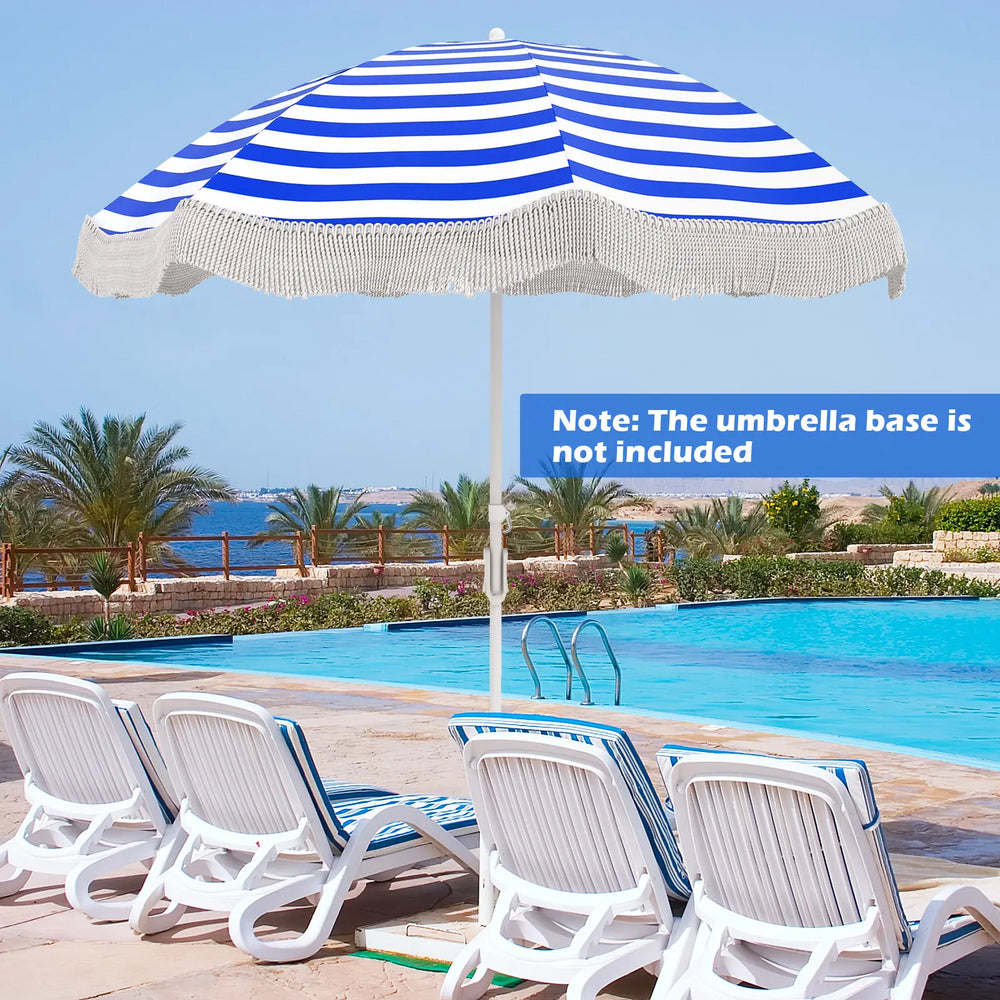 This patio fringe umbrella measures 180 x 180 x 210 cm (L x W x H), offering a cool and comfy shade area for enjoying outdoor leisure time with your family or friends. It adopts a UPF50+ sun-protective polyester canopy with silver coating, which could block up to 98% of the sun's harmful sunlight, ensuring your skin stays safe from sun damage. And the tilting angle can be adjusted in both directions, ensuring you can enjoy comprehensive sunshade coverage throughout the day. Other than that, the umbrella features compact carrying bag, make storage and transportation a breeze. With the combination of elegant tassels and delicate patterns on the canopy, this outdoor umbrella could adds a Bohemian flair to your outdoor space! UPF50+ Sun Protection: The 180 cm outdoor patio umbrella canopy is crafted of premium polyester fabric with silver coating, ensuring UPF50+ sun protection and effectively shielding you from over 98% of harmful sunlight. Additionally, it is also drizzle-resistant and wear-resistant for added durability.Push Button Tilt: The sunshade umbrella canopy can easily tilt 30 degrees to the left or right, which could block the sun from different directions, providing a cool shade area all the time. It is easy to adjust by pushing the aluminum alloy joint.Sturdy and Stable Structure: The fringe umbrella is equipped with a 20 cm extended spiral sand anchor, making it easy to set up and secure in the sand. And it is easy to operate by rotating the handrail. Besides, the umbrella is supported by a rustproof powder-coated metal pole, ensuring good sturdiness.Portable Design and Easy Setup: The umbrella can be easily detached and stored in a portable and lightweight carrying bag, which only weighs 2.5 kg, making transportation a breeze. Also, the 2-section umbrella is also easy to open by connecting 2 sections, pushing the button, and then inserting the latch for fixation.Elegant Fringe Design: This unique fringe patio umbrella is adorned with elegant tassels, decorative finial, and exquisite flower patterns/vibrant striped patterns/elegant cream-white appearance, which adds a fun and playful touch, creating a delightful vacation atmosphere. It is suitable for various occasions, such as gardens, poolsides, yards, commercial areas, etc.