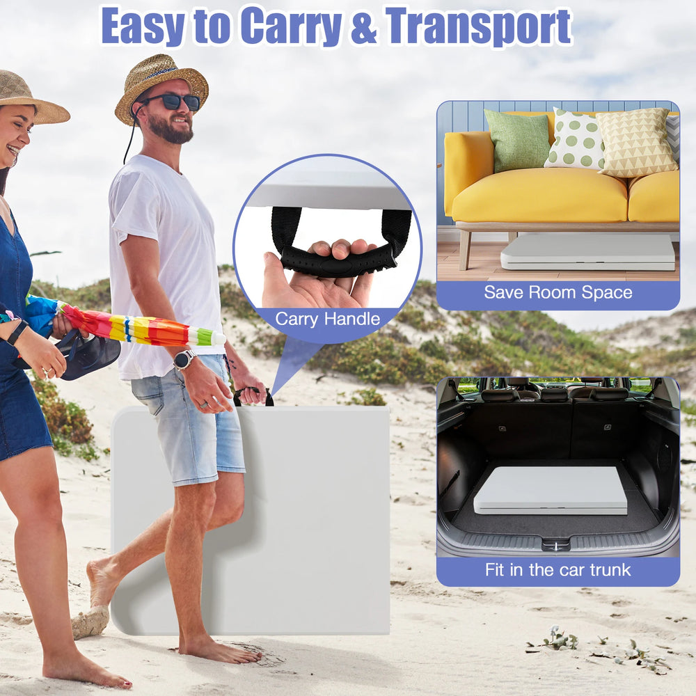 Color: White Material: HDPE, Metal, PP Product Dimension: 180 x 75 x 73 cm (L x W x H) Folding Size: 90 x 76 x 9 cm (L x W x Thickness) Carry Handle Size: 13 x 6 cm (L x W) Weight Capacity: 180 kg Net Weight: 13 kg Package Includes: 1 x Folding Table