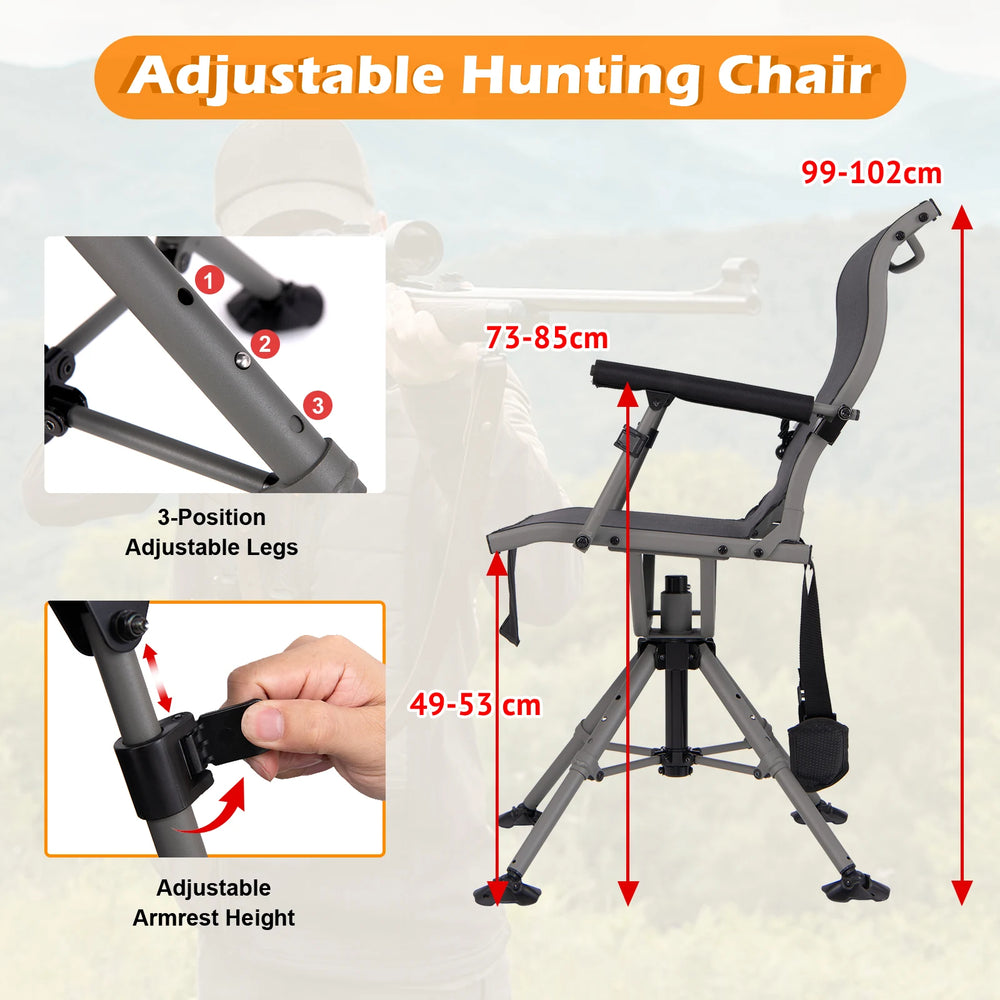 Colour: Black, Grey Material: Metal, Aluminum, Fabric Overall Dimensions: 89 x 62 x 99-102 cm (L x W x H) Dimension of Storage Bag: 20 x 16 cm (L x W) Dimension of Seat: 50 x 36 cm (D x W) Adjusting Height of Seat: 49-53 cm Adjusting Height of Armrests: 73-85 cm Weight Capacity of Seat: 150 kg Weight Capacity of Gun Holder: 10 kg Net Weight: 9.5 kg Package Includes: 1 x Hunting Chair 1 x Gun Holder 1 x Instruction Manual