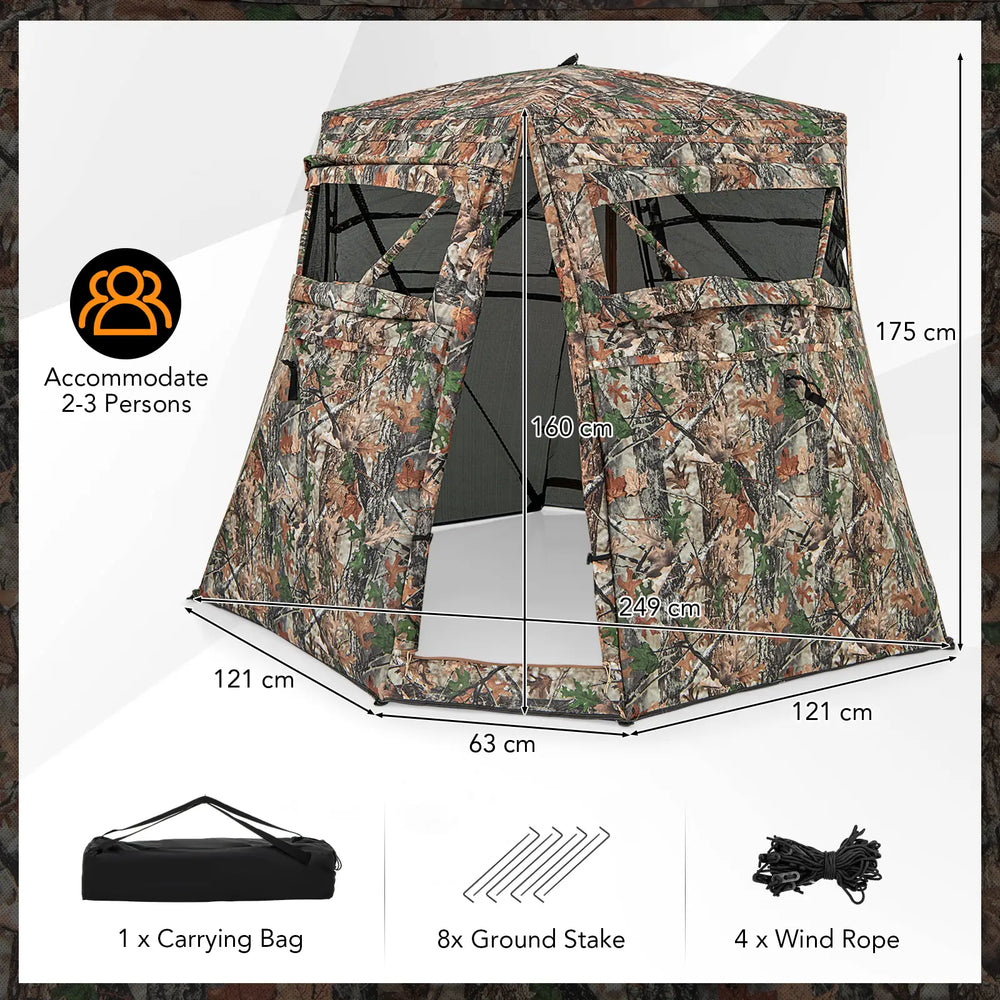 Color: Camouflage Material: 150D Oxford Fabric, PU Coating, Fiberglass Pole Overall Dimensions: 208 x 208 x 175 cm (L x W) Hub to Hub Size: 186 x 186 cm (L x W) Net Weight: 7 kg Package Includes: 1 x Hunting Blind 1 x Carrying Bag 8 x Ground Stake 4 x Wind Rope 1 x Users Manual
