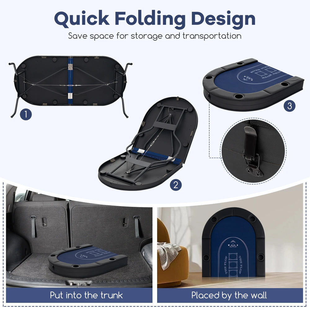 This 182 cm foldable poker table accommodates up to 8 players, which can be an ideal choice for family gatherings, entertaining friends, bar games, and more. When not in use, you can easily fold the table into a flat size, storing it in the closet, behind the door, under the bed, or in your vehicle. To enhance comfort and gaming experience, the poker table is equipped with padded railings for comfortable support, and 8 deeper metal cup holders for conveniently and safely keep drinks. Besides, the premium casino-grade felt surface completes the professional look, providing a smooth playing area and reducing noise from card shuffling. Elevate your gaming experience with this reliable and chic poker table. Bullet Points: Spacious Game Area and Versatile Use: This foldable poker table measures 182 x 82 x 75 cm (L x W x H), which could comfortably accommodate 6-8 players for games like blackjack, Texas Hold’em, or any card game of your choice. It is ideal for family nights, parties, events, outdoor picnics, camping trips, gatherings, travels, and more. Quick Foldable Design and Easy Setup: This card board game table can be effortlessly folded into a compact size by folding legs and the tabletop, which would not take up much floor space when not in use. And there is a safety lock to secure it in place. Additionally, assembly is also a breeze - just unfold and secure tabletop the support legs. Luxurious Padded Railings: There are thick cushioned armrests around the edge of this casino table, providing soft support for arms during gameplay. And the railings with PU leather covering not only offer a deluxe feel, but also resist water and stains, ensuring lasting elegance. Casino-Grade Felt Surface: The poker tabletop is made of high-quality casino-grade felt that is smooth, wrinkle-free, and pill-free. Thus it could minimize noise when handling cards while making it easy to take out cards. And there are unique patterns to enhance your gaming experience. 8 Built-in Deeper Metal Cup Holders: Unlike others with shallower plastic cup holders, the adopt 6 cm deeper metal cup holders, which could keep your drinks securely when playing, preventing spills and providing a convenient place to keep beverages while you focus on the game. Sturdy and Stable Structure: The poker table boasts a robust metal frame with reinforced braided metal cables, ensuring good strength and stability during intense gameplay. And it is equipped with anti-slip footpads for enhanced security.
