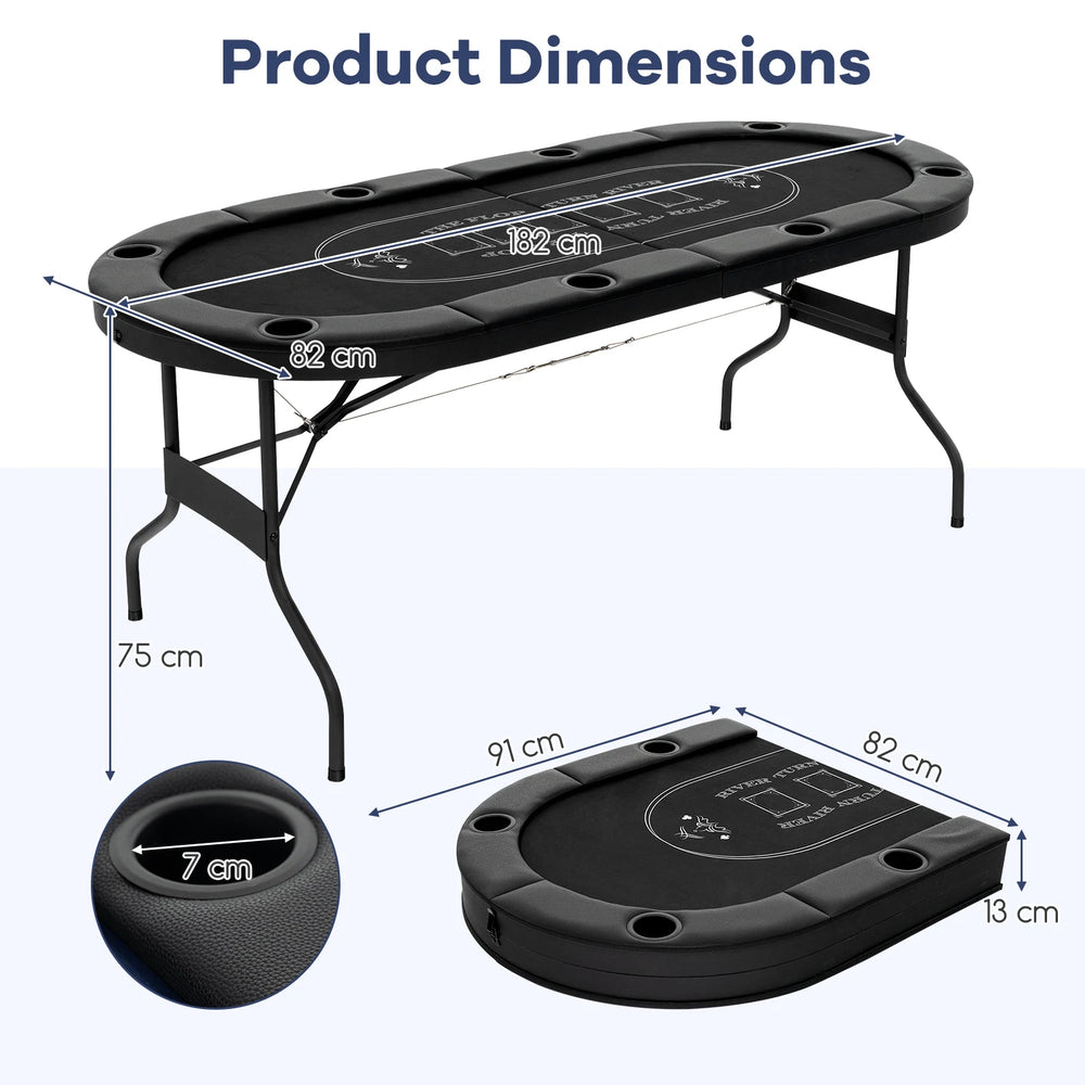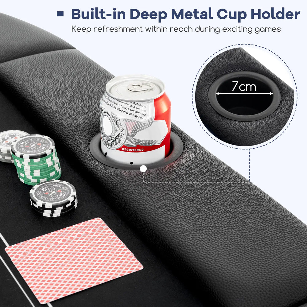 This 182 cm foldable poker table accommodates up to 8 players, which can be an ideal choice for family gatherings, entertaining friends, bar games, and more. When not in use, you can easily fold the table into a flat size, storing it in the closet, behind the door, under the bed, or in your vehicle. To enhance comfort and gaming experience, the poker table is equipped with padded railings for comfortable support, and 8 deeper metal cup holders for conveniently and safely keep drinks. Besides, the premium casino-grade felt surface completes the professional look, providing a smooth playing area and reducing noise from card shuffling. Elevate your gaming experience with this reliable and chic poker table.     Bullet Points: Spacious Game Area and Versatile Use: This foldable poker table measures 182 x 82 x 75 cm (L x W x H), which could comfortably accommodate 6-8 players for games like blackjack, Texas Hold’em, or any card game of your choice. It is ideal for family nights, parties, events, outdoor picnics, camping trips, gatherings, travels, and more. Quick Foldable Design and Easy Setup: This card board game table can be effortlessly folded into a compact size by folding legs and the tabletop, which would not take up much floor space when not in use. And there is a safety lock to secure it in place. Additionally, assembly is also a breeze - just unfold and secure tabletop the support legs. Luxurious Padded Railings: There are thick cushioned armrests around the edge of this casino table, providing soft support for arms during gameplay. And the railings with PU leather covering not only offer a deluxe feel, but also resist water and stains, ensuring lasting elegance. Casino-Grade Felt Surface: The poker tabletop is made of high-quality casino-grade felt that is smooth, wrinkle-free, and pill-free. Thus it could minimize noise when handling cards while making it easy to take out cards. And there are unique patterns to enhance your gaming experience. 8 Built-in Deeper Metal Cup Holders: Unlike others with shallower plastic cup holders, the adopt 6 cm deeper metal cup holders, which could keep your drinks securely when playing, preventing spills and providing a convenient place to keep beverages while you focus on the game. Sturdy and Stable Structure: The poker table boasts a robust metal frame with reinforced braided metal cables, ensuring good strength and stability during intense gameplay. And it is equipped with anti-slip footpads for enhanced security.