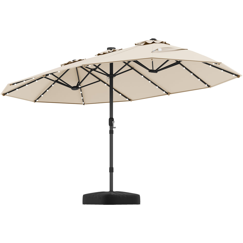 This 445 x 260 cm double-sided patio umbrella provides an extra large shading coverage, ideal for a variety of settings, from a lively backyard barbecue to tranquil poolside lounging. Not only offering unparalleled shade, it could also create a charming ambiance for your evenings with the built-in LED lights, which are powered by a solar panel, providing bright and inviting illumination for 6-8 hours. Furthermore, our umbrella includes a weighted base with 2 sandbags that could hold up to 80 kg sand, complement with 5+2+5 sturdy metal umbrella ribs and a safety latch, ensuring a secure and stable setup in slightly windy conditions, while the air vent on the top that further enhances overall stability and promotes ventilation. The premium polyester canopy with PA coating provides superior durability and protection against outdoor elements. Assembly and disassembly is also a breeze with the hassle-free crank handle. Whether day or night, our solar-light patio umbrella is designed to create the perfect outdoor sanctuary where you can relax, entertain, and enjoy the outdoor moments of life. Extra-Large Coverage: This double-sided patio umbrella measures 445 x 260 x 250 cm (L x W x H), offering a spacious shade area for your outdoor gatherings. It is ideal for patio dining settings, poolside relaxation, backyard events, and more. Solar Powered LED Lights: The umbrella ribs are equipped with 48 cool-white light beads, which are designed to brighten and enhance the romantic feel of your yard. The lights are powered by a solar panel, which could last for 6-8 hours after a full charge, saving energy. Note: It includes a handy switch, and we recommend turning off the power during the day to for better charging. Weight Umbrella Base Included: This large market table umbrella comes complete with a weighted base, including 2 sandbags that could withstand a weight of 80 kg, ensuring excellent stability. Moreover, it is constructed with 5+2+5 sturdy umbrella ribs and secured with safety latch for enhanced security. Note: The package includes a 38 mm adapter to fit other umbrella bases. Sandbag included, sand not included. Premium Double-Tiered Canopy: The canopy is crafted of premium 180GSM polyester fabric with PA coating, which is sun-protective, water-repellent, and fade-resistant, designed to handle the elements. Moreover, it features an air vent for optimal airflow and enhanced stability. Note: In severe weather, please close your umbrella to prolong its life. Easy Setup and Takedown: This patio umbrella comes in 2 sections and a base that can be effortlessly connected, and there is a hassle-free crank handle, making it easy to open and close the umbrella. Additionally, when not in use, the umbrella can be secured by the fixing strap, ensuring secure closure.