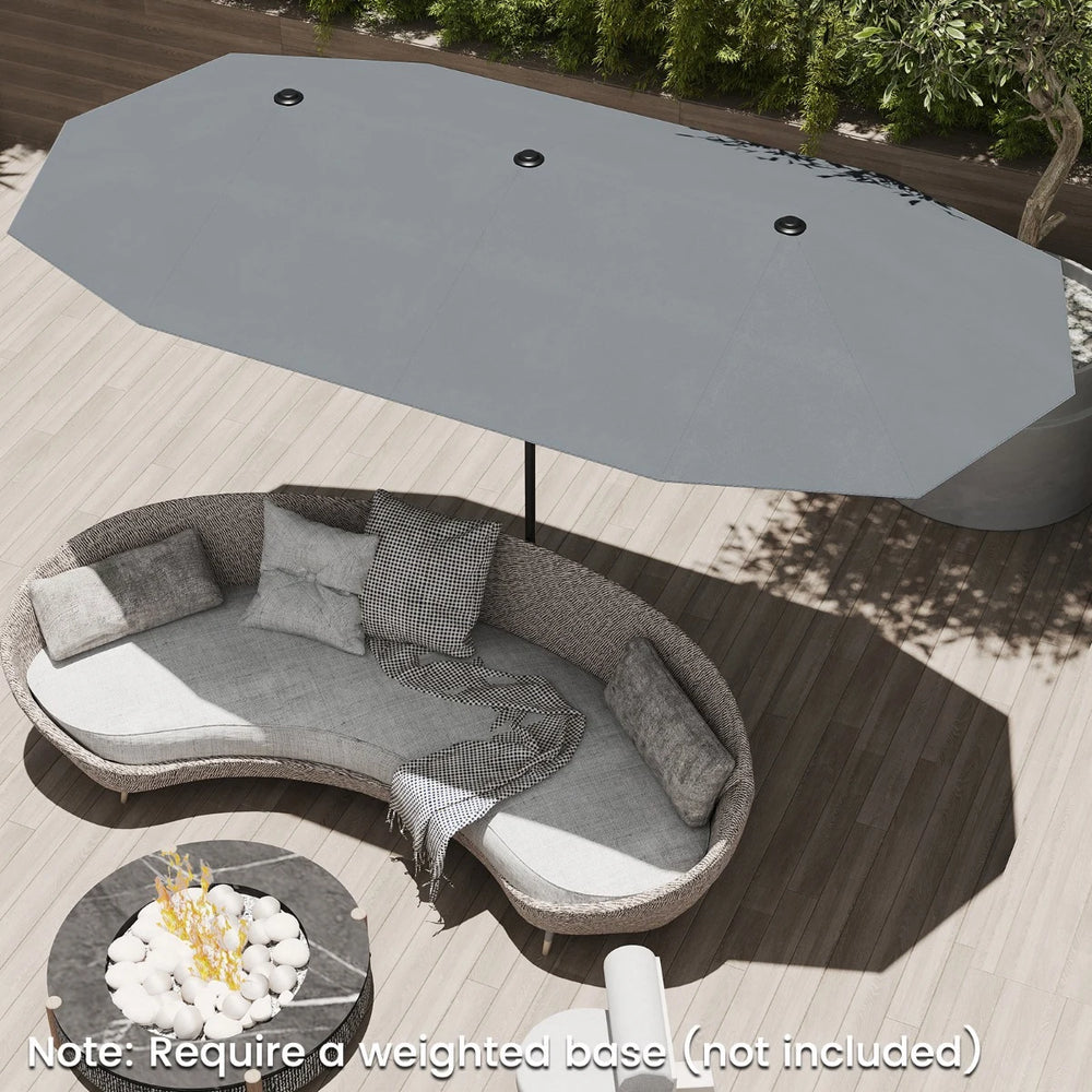 Color Beige/Coffee/Grey/Navy/Orange/Red Material Polyester Fabric, Metal Product Dimensions 13 x 7 x 7.3 ft Ground Clearance 6 ft Net Weight 18.5 lbs Box QTY 1(May vary by batch) Package Includes 1 x Double-Sided Patio Umbrella 1 x User’s Manual