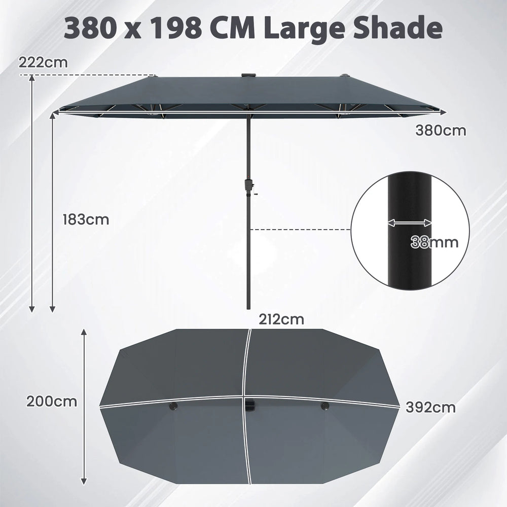 Color Beige/Coffee/Grey/Navy/Orange/Red Material Polyester Fabric, Metal Product Dimensions 13 x 7 x 7.3 ft Ground Clearance 6 ft Net Weight 22.5 lbs Box qty 1 Package Includes 1 x Double-Sided Patio Umbrella, 1 x User’s Manual