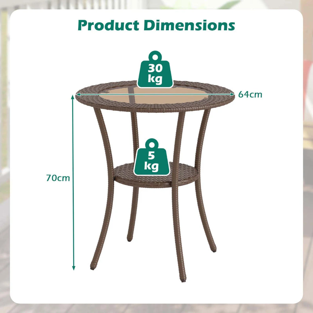 Colour of PE Rattan: Brown Colour of Tabletop: Dark Brown Material: PE Rattan, Steel, Tempered Glass Overall Dimension: 64 x 70 cm (Dia. x H) Diameter of Storage Shelf: 37 cm Net Weight: 6 kg Weight Capacity of Tabletop: 30 kg Weight Capacity of Storage Shelf: 5 kg Package Includes: 1 x Outdoor Dining Table 1 x Instruction Manual Box QTY: 1(May vary by batch)