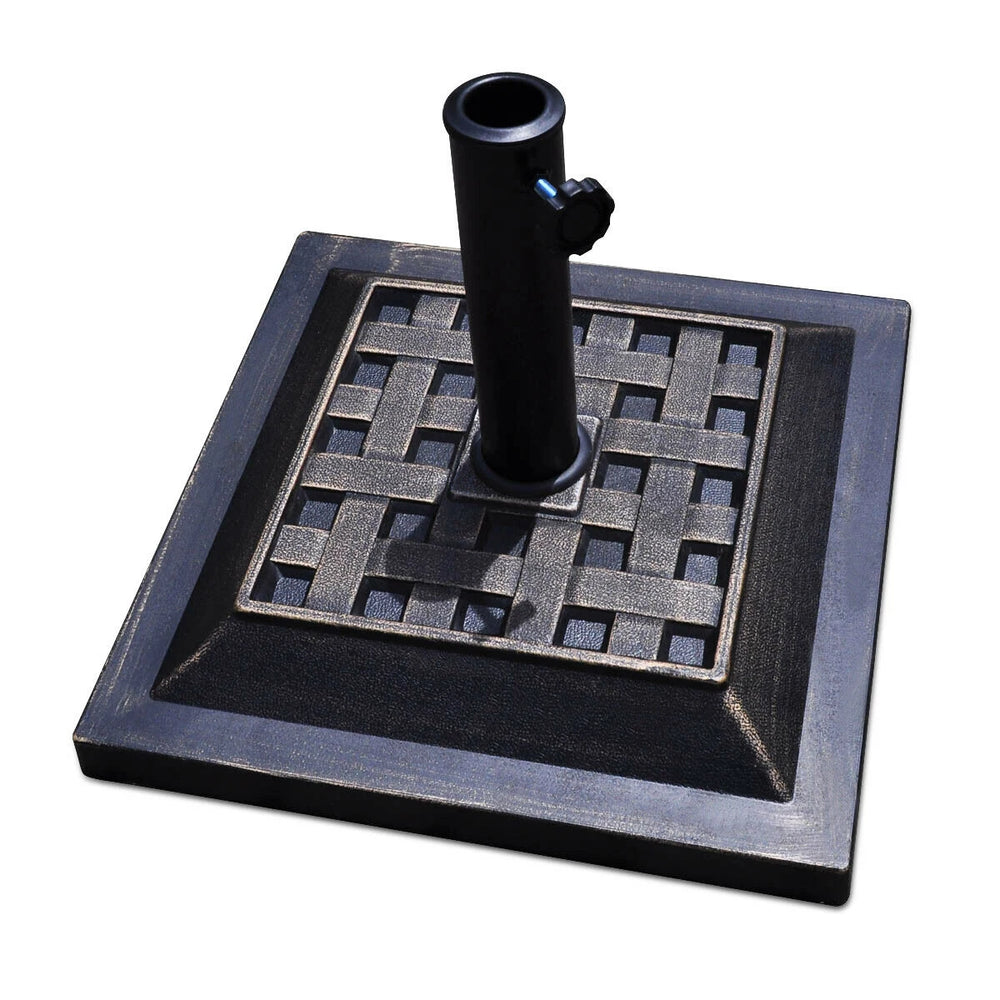 Color: Bronze Material: Resin + Steel Overall dimension: 44cm x 44cm x 33cm (L x W x H) Fit umbrella pole: 38mm - 48mm (Standard Sizes) Product weight: 12kg