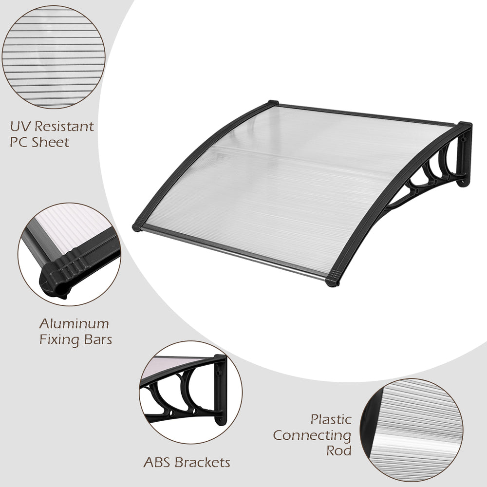 Material: Polycarbonate + aluminum Size: 100 x 100 x 28cm (L*W*H) Box Qty:1(May vary by batch)Package includes: 1 x Canopy awning 1 x Instruction
