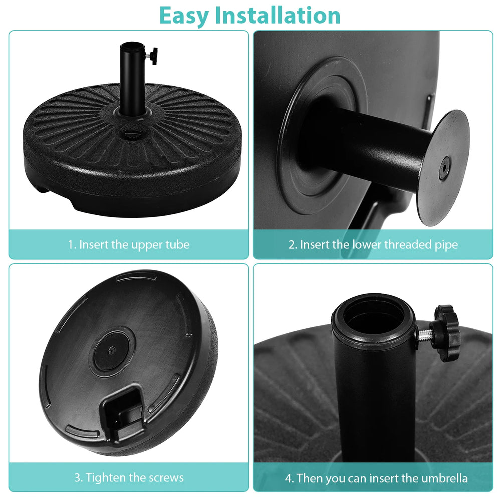 Material: HDPE and steel Product size: 20.0" x 4.7"(Dia x H) Product weight: 4.8 lbs Suit for Φ38mm or Φ48mm umbrella pole 23L water needed to fill full the umbrella base Package include: 1 x Water-filled umbrella base