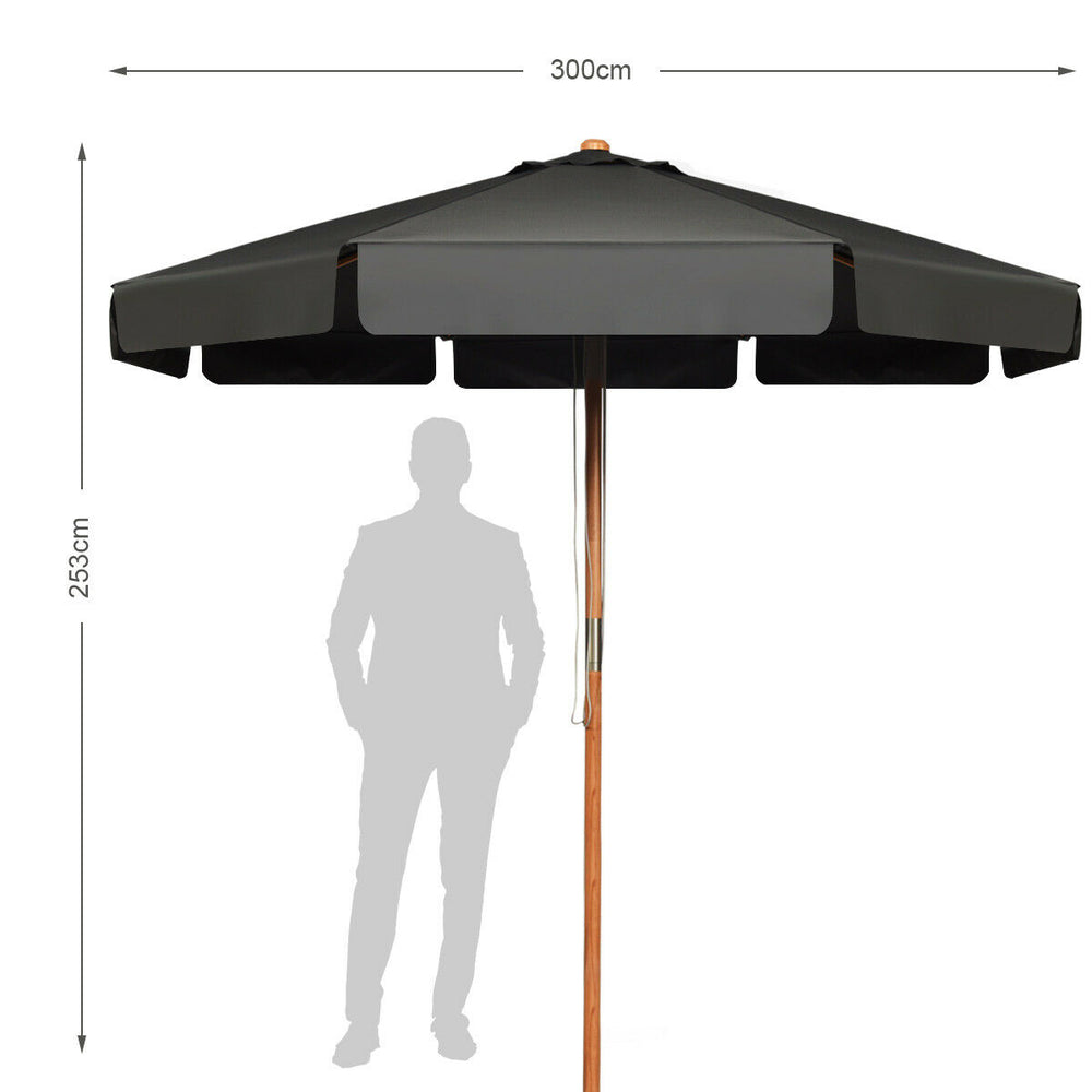 Colour: Beige / Grey Material: Beech Wood, Whitey Wood, Polyester Fabric, Zinc Alloy, Aluminium, Plastic Dimension: 300 cm x 300 cm x 253 cm (Diameter x H) Pole Diameter: 48mm Gross Weight: 9.5 kg Package Includes: 1 x Patio Umbrella 1 x Instruction Manual