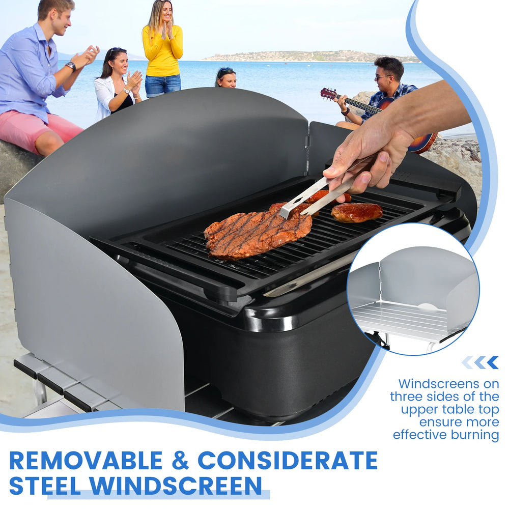 Color: Black/Gray Material: Steel, Aluminum, MDF, Oxford Fabric Overall dimension: 68" x19'' x 43.5'' (L x W x H) Carrying bag size: 31" x 5'' x 19'' (L x W x H) Net weight: 27.5 lbs Tabletop weight capacity: 55 lbs Package includes: 1 x Portable grill table 1x Portable bag 1 x User manual