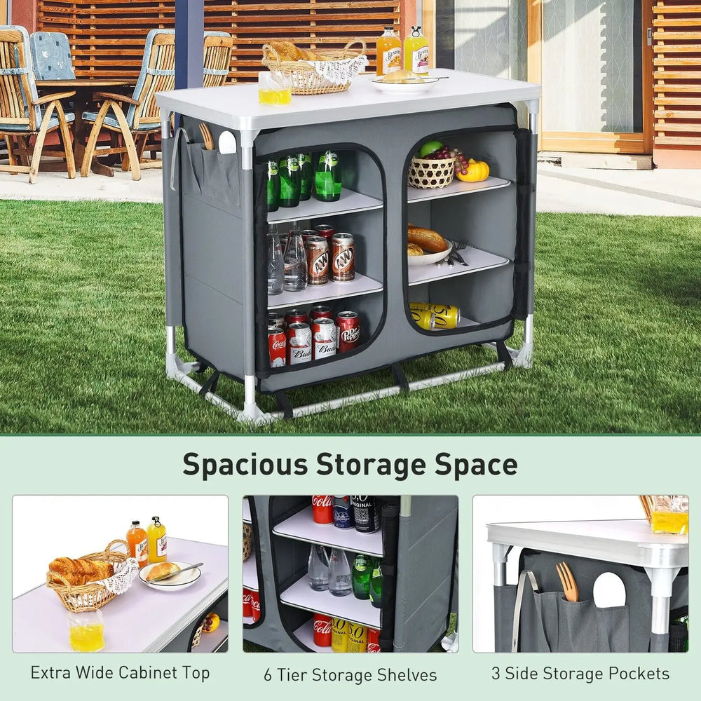 This camping table will be the perfect assistant for your outdoor activities! Designed with a large tabletop and 6 shelves, this picnic table provides spacious storage space for you to put in various items. Meanwhile, all of them are crafted of high quality MDF, which is easy to clean. In order to keep the inside items clean and hygienic, you can zip up. Furthermore, the premium aluminum makes this outdoor cook station anti-rust and stable for outdoor use. When the outdoor activity is finished, you are able to disassemble this camp table quickly and then put all parts into the carrying bag for easy movement and storage. Bullet Point: Spacious Storage Space: Featuring 1 large tabletop and 6 practical shelves, this outdoor camping table comes with ample storage space so that you can put different belongings, such as food, tableware and others, making them within reach. Likewise, there are 2 zippered bags to keep food clean and hygienic. Premium Aluminum Camp Table: Considering its durability and stability, this portable picnic table is constructed of high quality aluminum frame, which is rustproof for outdoor use and sturdy enough to hold various items. Besides, the tabletop and each shelf are made of premium MDF for long time use. Portable Design with Carrying Bag: This outdoor kitchen cook station includes a carrying bag with shoulder straps that allows you to carry it without hassle. Meanwhile, the lightweight design makes carrying easier and more effortless. And the storage is convenient as well. Designed for Versatility: Apart from serving as a camping table, this multi-purpose table can be used as a picnic table and kitchen cook station for enjoying outdoor leisure time. If you want to use indoors, this versatile table is able to accommodate different tableware in your kitchen or various tools in your garage. Considerate Details: The 4 corners of the tabletop are rounded in order to ensure you and others' safety. Moreover, the high quality oxford fabric stands the test of time. And the installation of this camping table is easy. You do not need any tools to assemble it. Features: Holds different belongings with ease thanks to its large tabletop and 6 shelves Zippered bags to keep inside items clean and hygienic High quality and rustproof aluminum frame for stability and durability Ensure you and others' security with round edge design Durable oxford fabric and thick MDF for long service time Convenient to carry and store because of its included carrying bag Suitable camping, BBQ, picnic in the beach or backyard, etc Smooth surface for easy maintenance Tool-free assembly for time-saving Specifications: Color: Gray Material: Aluminum, Oxford Fabric, MDF, PP Overall Dimension:96 x 49 x 81.5 cm (L x W x H) Dimension of Carrying Bag:98 x 50 x 11 cm (L x W x Thickness) Size of Each Shelf:40 x 40 cm (L x W) Net Weight:8.5 kg Weight Capacity of Tabletop:20 kg Weight Capacity of Each Shelf:5 kg Package Includes: 1 x Camping Table 1 x Carrying Bag 1 x Instruction Why You Choose Our Camping Table? Can be accommodated with different items with ample storage space Can carry and store easily with included carrying bag