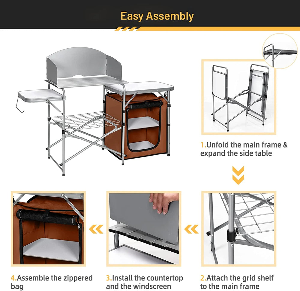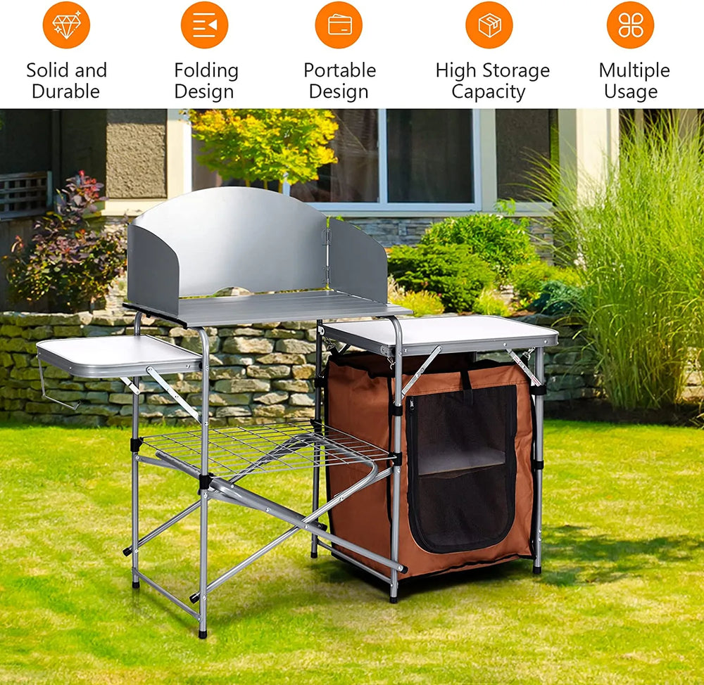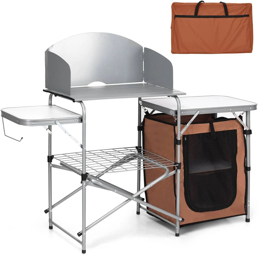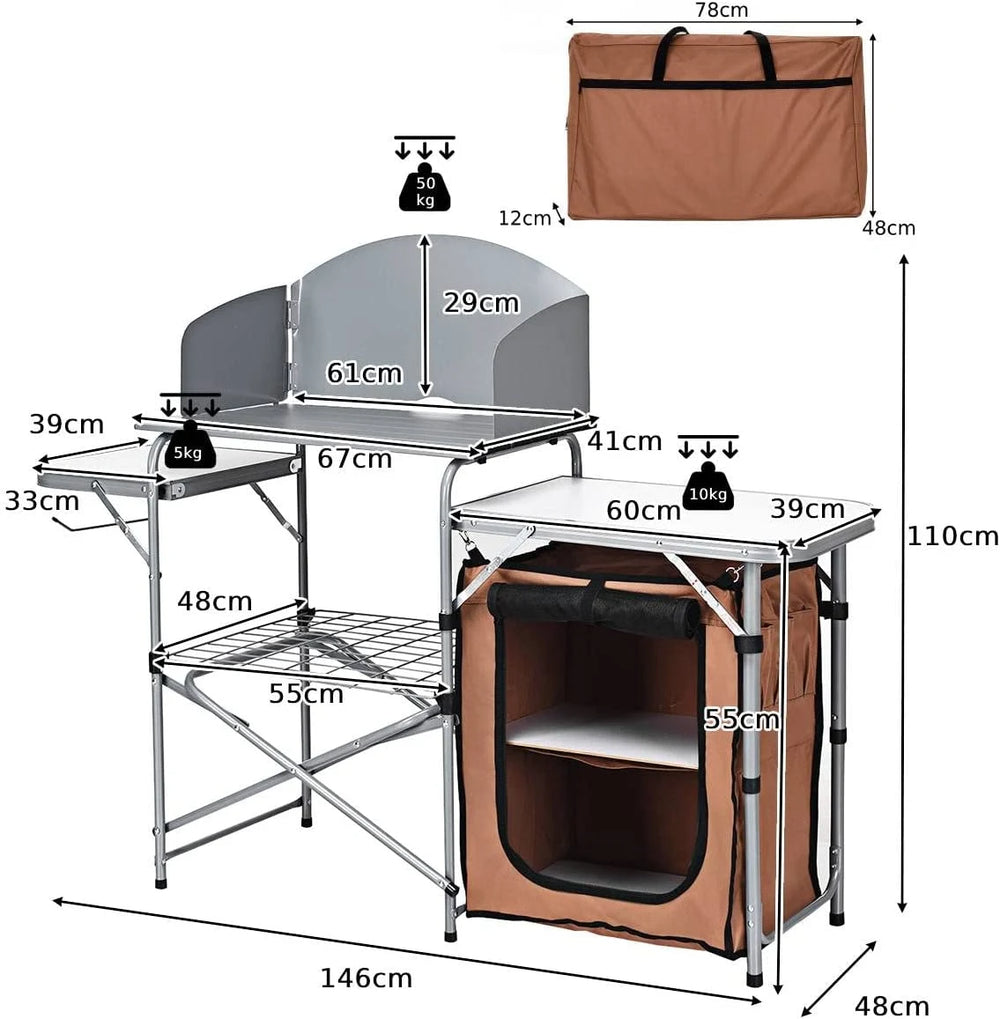 Enjoy convenient and happy outdoor camping with our folding camping table! This portable kitchen table is perfect for versatile use in picnics, BBQ, camping and so on to provide you with a premium cooking station. The sturdy aluminum frame and the MDF tabletop will keep your cooking in a stable condition. Three-side windscreens can ensure the heat retention and allow enjoying meals faster. You can put tools and spices on the rack which is within your reach at anytime. One-piece design allows for easy folding and storage when not in use and save a lot of space. It will surely be a perfect addition to your outdoor activities! Bullet Point: Optimal Outdoor Camp Storage Solution: This camping table features multiple storage options for your outdoor activities. The three tabletops provides large space to hold your food while the storage rack beneath can make tools and spices within reach. Besides, the storage bag with zipper can prevent your food from dust and pests and keep them fresh. Strong Construction & Durable Material: The camping table is crafted by aluminum tubes which is sturdy for long-term outdoor use. The storage bag is made of premium Oxford to ensure its durability. Plus, the MDF tabletop is heat-resistant for putting grill or stove. Suitable for Multiple Occasions: This portable camping table is ideal for being used in multiple outdoor activities, such as BBQ, picnics, camping, parties, etc. as a practical cooking assistant. You can easily carry and transport it to anywhere you like with the carrying bag included. Humanized Details for Better Use: The middle tabletop is surrounded by windscreens on three sides, which guarantees more effective cooking even in windy days. Moreover, there is a metal hook on one side for hanging towels or paper rolls conveniently. Hassle-free Assembly & Foldable Design: You can expand the main frame and finish the rest assembly of this camp table effortlessly in several minutes with its one-piece design. When not in use, you can fold it into a compact size for easy storage and saving space. Features: Constructed with high quality aluminum frame with high stability and durability Equipped with a storage bag to keep your food away from dust and pests Storage rack beneath the tabletop for storing tools and other supplies Three MDF tabletops have large space and are easy to clean for further use Three-side windscreens block out the wind and ensure effective burning X-shaped bracket enhance the overall solidness when in use Metal side hook allows hanging towels and paper rolls within reach Suitable for outdoor camping, picnics, BBQ, parties, etc. Hassle-free installation saving time and efforts Specifications: Color: Coffee/Gray Material: Aluminum, steel, 600D oxford, PVC, MDF Overall dimension: 146 x 46 x 112 cm (L x W x H) Dimension of carrying bag: 79 x 48 x 13 cm (L x W x H) Weight capacity of middle tabletop: 21kg Weight capacity of side tabletops: 10kg Net weight: 9.5kg Package Includes: 1 x Folding Camping Table 1 x Carrying Bag 1 x User`s Manual