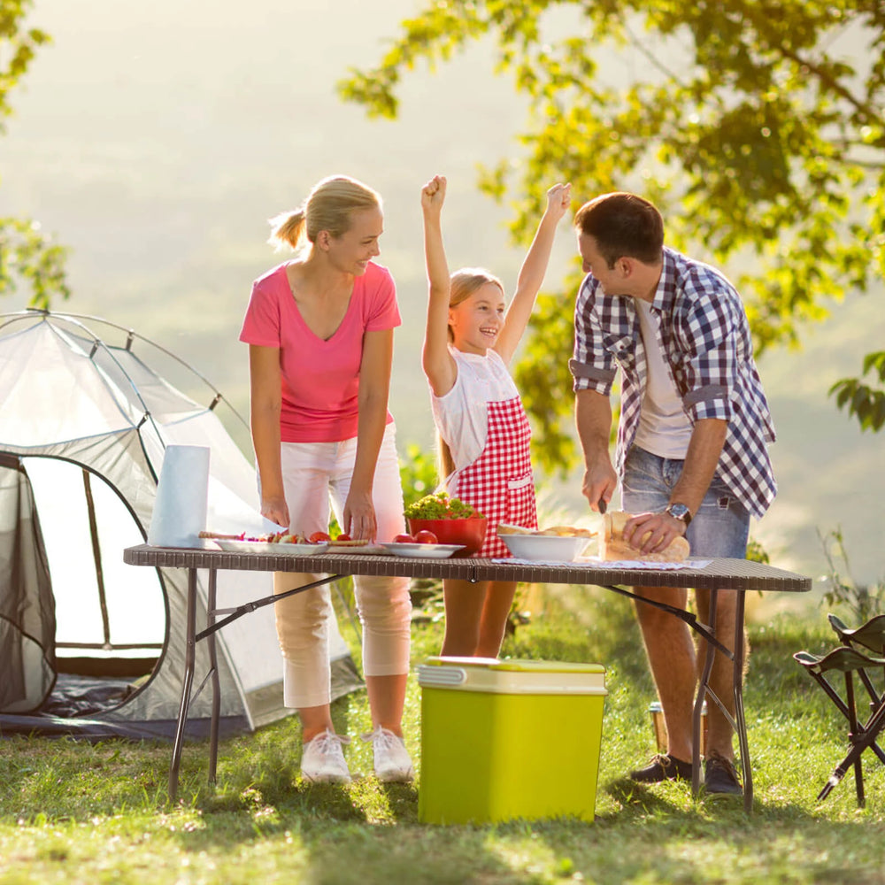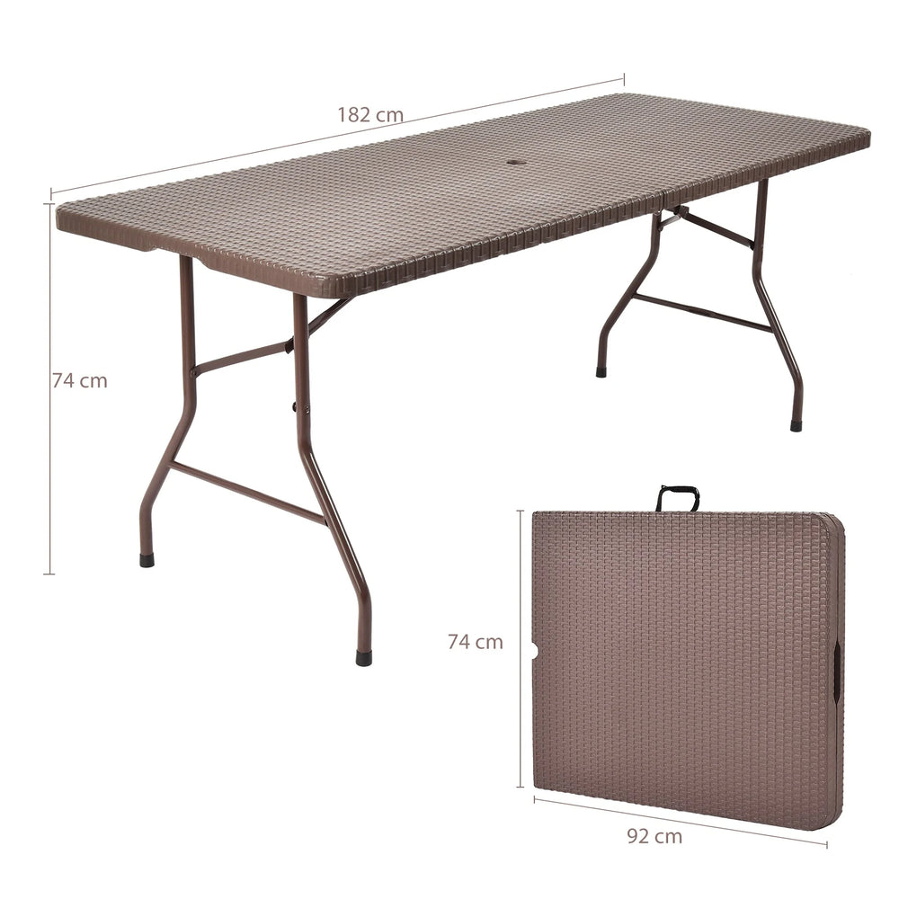 Color: Brown Material: HDPE + thick steel Pattern: Rattan design Product size: 6' x 30" x 30" (L x W x H) Folded size: 3' x 30" x 3" (L x W x H) Weight capacity: 330 lbs Package weight: 35 lbs Package includes: 1 x folding table