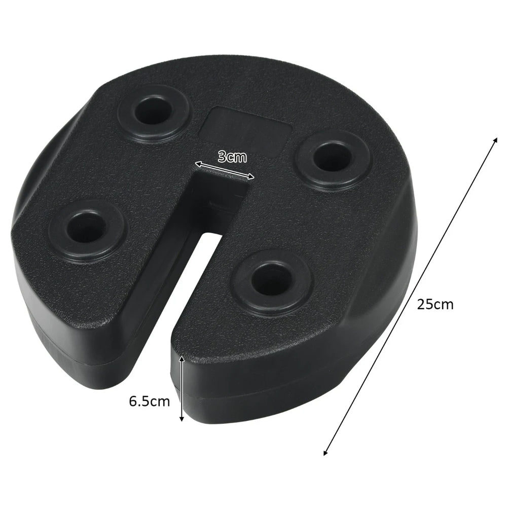 Color: Black Material: PE Product dimensions: 9.5''x 9.5''x 2.75'' (L x W x H) Net weight: 4.5 lbs / set Weight of filled with water: 5 lbs per plate Pole size requirements: up to 1.25'' wide Package includes: 6 x Weight plate 2 x Strap