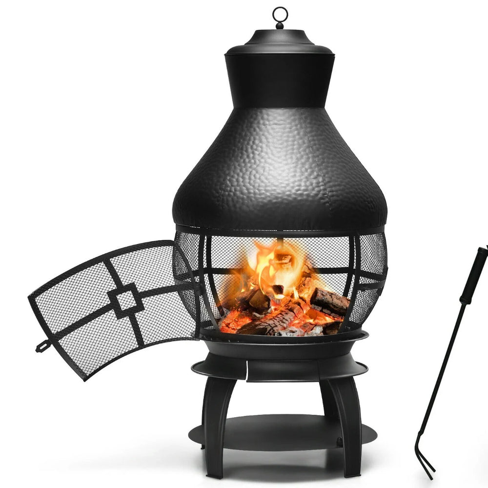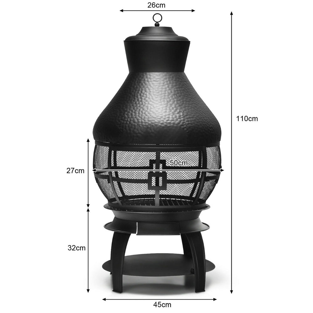 Color: Black Dimension: 20" x20" x 43.5" (L x W x H) Net weight: 22 lbs Package Included: 1 x Chimenea 2 x Charcoal grid 1 x Chimney mesh cover 1 x Poker 1 x Cap