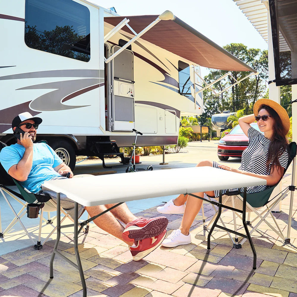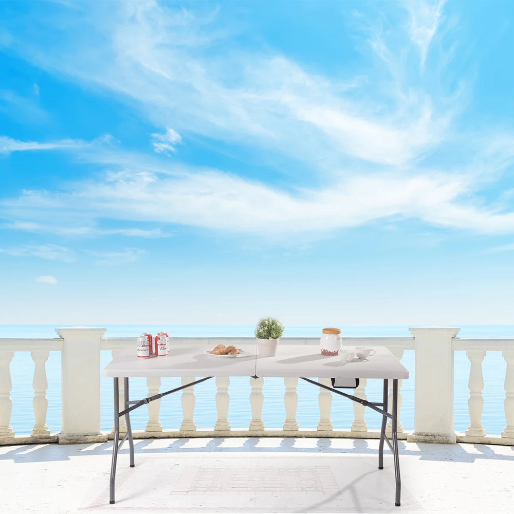 Specific information Non-slip pads Materials: durable powder coated steel frame and HDPE Colour: white Dimensions After unfolding Length: 153 cm Width: 74 cm Height: 74 cm Before unfolding Length: 77 cm Width: 74 cm Height: 8 cm Table top thickness: 3.8 cm Weight: 14.5 kg
