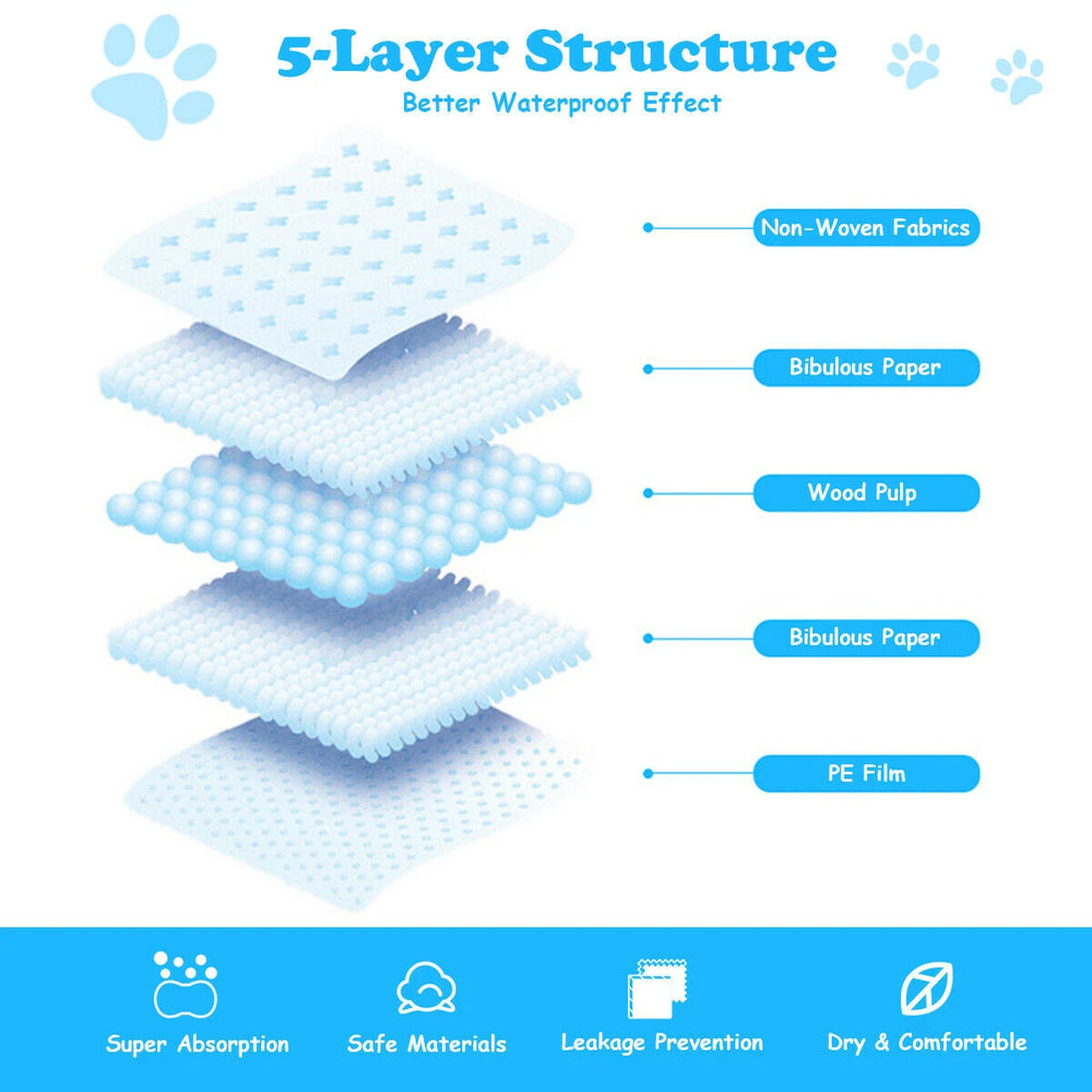Find the fast way to clean up your floor with our pet pee pads 150 Pcs! Quilted with 5 layers, these pet pee pads are soft and durable with the ability to absorb and lock the wetness inside. Coming with 10 bags of a total of 150 pcs and measuring 75 x 75 cm, these pads provide a whole days protection with XL coverage on your floor, and carpet, suitable to use under the crates, feeding area, potty area, and more. It has anti-slip PE film backing making sure the pad will not easily move and be damaged. You can use our pee pads to train puppies, look after elder dogs from small to large sizes, and keep your home tidy and smell-free. Bullet Points: Thicken &Super Absorbent Design: Our dog training pee pad is thickened and quilted with 5 layers, which can quickly absorb the wetness. It can also turn liquid into gel instantly to keep floors dry and easy to clean up as well as greatly neutralize odour. Leak-Proof & Anti-Skid to Keep Clean: The plastic backing (PE film) can effectively lock the wetness and prevent the urine from being spilled out or leaking. And with anti-slip straps, the pee pad protects your floor or carpet without being easily moved by running pets. Large Coverage with XL Size: This dog pad measures 75 x 75 cm, providing a great amount of coverage on your sofa, kennel, floor, car seat, and more. They are known as potty pads, wee-wee pads, piddle pads, or dog training pads for large to small-sized pets, puppies, rabbits, and so on. Pet and Owner-Friendly Pee Pads: The surface of this pee pad is made with soft-touch non-woven fabric with grind indentation & uniform texture, which is comfortable for pets to step on. The disposal feature provides all-day protection with no need for washing or maintenance. Premium Tear-resistance Quality: Made with high-quality materials, this pet pee training pad is safe for pets to use and can withstand whole-day use with tear-resistant durability. These pet pee pads come in 10 bags, a total of 150 Pcs that could be used for a great while. Feature: 75 x 75 cm extra large size for small to large-sized pets, doggies, cats, rabbits and more Use to cover your floor, sofa, car seat, under the feeding bowl or cat litter box Super absorbent and quickly dry to keep your home clean and fresh Anti-slip and tear-resistant PE film backing for safe and long-time use Easy to clean up the floor, lasts for the whole day and disposal design 10 bags, 150 pcs ensures months of supply 5-layer thickened design, comfortable and soft for pets to use Specification: Material: Non-Woven Fabrics + Bibulous Paper + Wood Pulp + Bibulous Paper+ PE Film Colour: As the picture shown Product dimension: 75 x 75 cm Net weight of each pad: 50g Package Includes: 10 x Pet Pee Bags