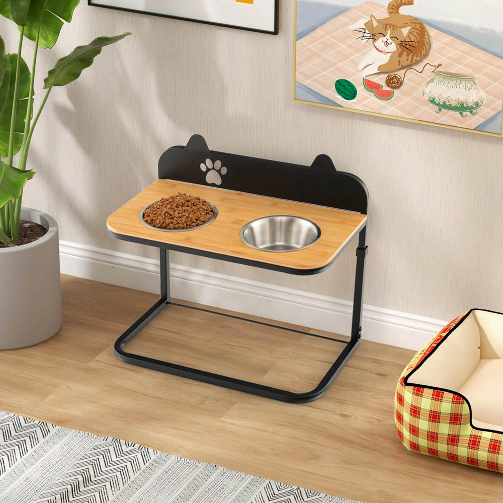 Color: Black and Natural Material: Bamboo, Metal, Stainless Steel Overall Size: 21'' x 12''x 21'' (L x W x H) Bowl Size: 7'' x 2.5'' (Dia. x H) Adjustable Table Height: 12'', 14'', 16'' Net Weight: 6.5 lbs