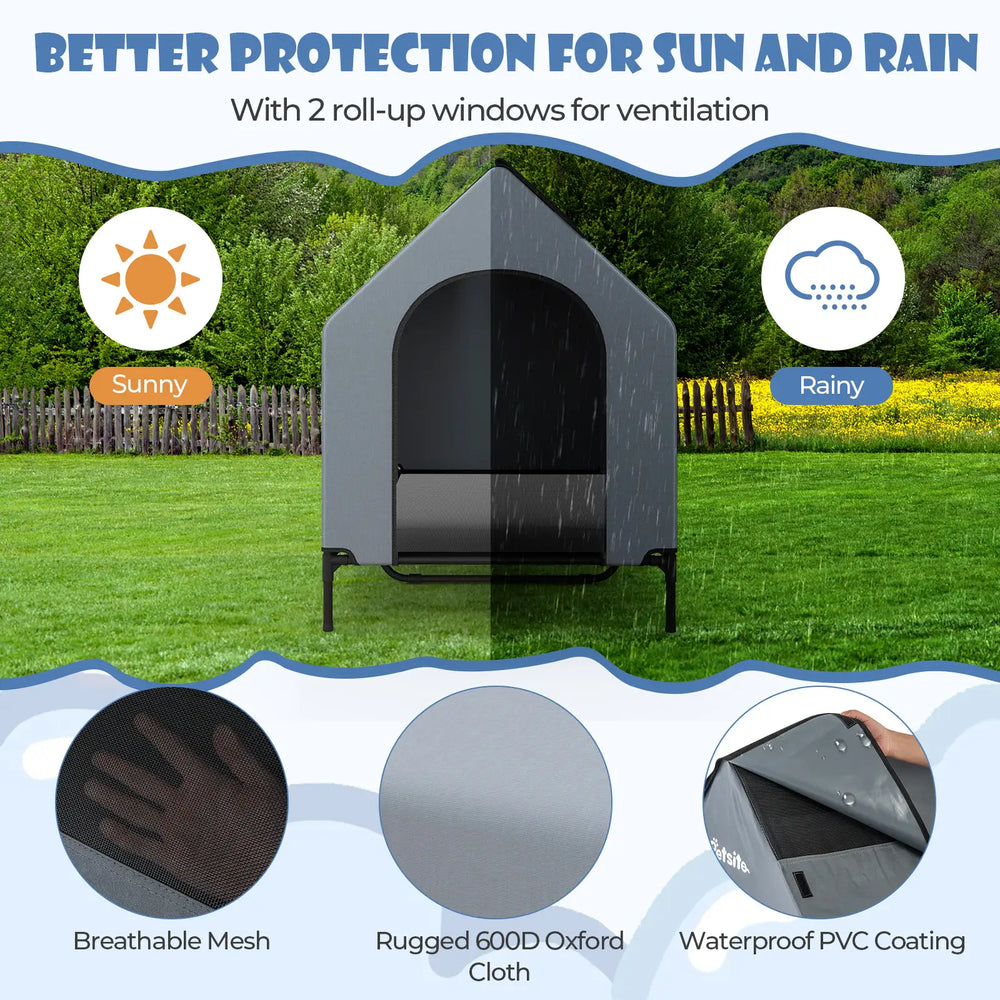 There are 3 size options for you to choose from for puppies, small-sized, medium-sized, and large-sized dogs, and it is necessary to choose a comfortable house according to your dog's height and length. The canopy is crafted of 600D oxford cloth with waterproof PVC coating, which offers superior sun and rain protection, ensuring your pet stays dry and comfortable. And constructed of heavy-duty metal tubes and reinforced by anti-slip covers, this dog house provides a stable and secure shelter for your pet. The elevated design also keeps your furry friend away from wet and hard ground. Additionally, the mesh fabric dog bed is detachable for easy maintenance, keeping clean and hygienic. When indoors, it can be used as a dog bed without a cover for comfy resting, and when outdoors, it can be used as a dog house for better protection.     Bullet Point: Spacious and Elevated Design: The dog house measures 64 x 91 x 86 cm/75 x 110 x 106 cm/84 x 132 x 114 cm (L x W x H), which is ideal for small/small-medium/small-large-sized pets up to 30 kg/40 kg/50 kg (Note: Please measure the body length and height of your pet before purchase). Moreover, the 14.5 cm/16 cm/18 cm elevated design keeps your pet off damp ground, promoting airflow and ensuring a comfortable resting space. Better Protection for Sun and Rain: The canopy is crafted from robust 600D Oxford fabric with a waterproof PVC coating, providing superior protection against outdoor elements. Additionally, there are 2 roll-up mesh windows on the roof, offering ventilation while keeping out the sun and rain. Sturdy and Stable Construction: This elevated dog house is supported by a high-strength metal frame, providing structural support and ensuring long-lasting durability. Besides, it boasts anti-slip covers for better stability, preventing any wobbling or tipping (The medium-sized dog house has an extra U-shape supporting bar and the large has 2 additional supporting bars). Effortless Cleaning for Great Convenience: The dog bed features a high-density mesh fabric mat that is breathable, scratch-resistant, and easy to clean. Simply rinse and wash for hassle-free maintenance, keeping your pet's resting area fresh and hygienic. 2-in-1 Multifunctional Design: The canopy can be detached, thus you can easily convert the dog house into a comfortable dog bed, which is suitable for both indoor and outdoor use. Besides, with its simple structure and numbered parts, it is easy to set up this dog house with no tools required.     Features: Adopts thickened 600D Oxford canopy with waterproof coasting, resists sun and rainComes with 2 roll-up windows for ventilation, crafted of breathable meshThe mesh fabric mat is anti-scratch and reliable, easy to cleanThe elevated bottom enhances airflow and comfort, away from damp surfacesSupported by a high-strength metal frame, not easy to rust or deformWith reinforced supporting bars, ensure strong loading capacityWith protective covers on the legs, prevent slipping or sinking on soft groundsThe mesh fabric bed is washable and can be easily rinsed, easy to maintainDetach the cover, the dog house can be converted into a dog bedAdopts convenient connectors and hook and loop fasteners, easy to install, no tools requiredCan be folded into a compact size, is easy to carry, perfect for indoor and outdoor use