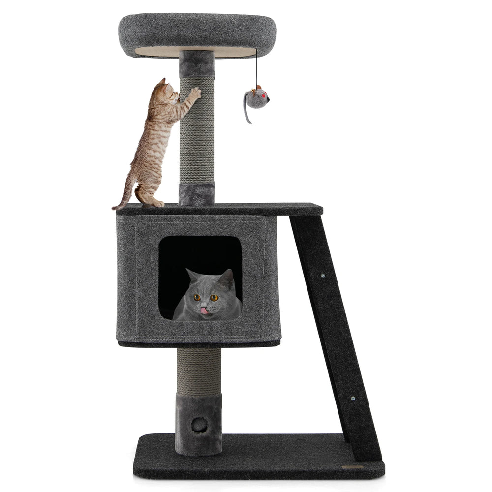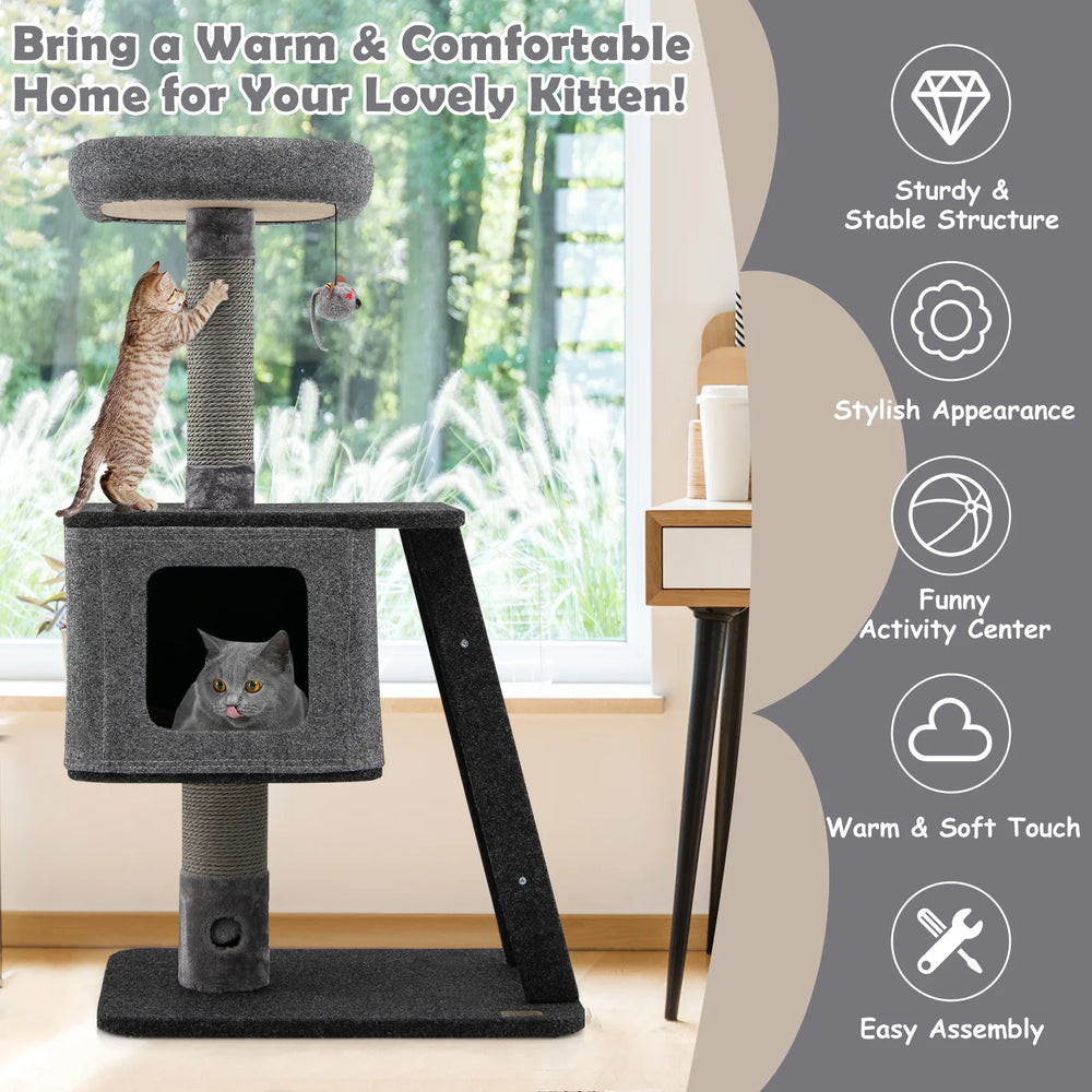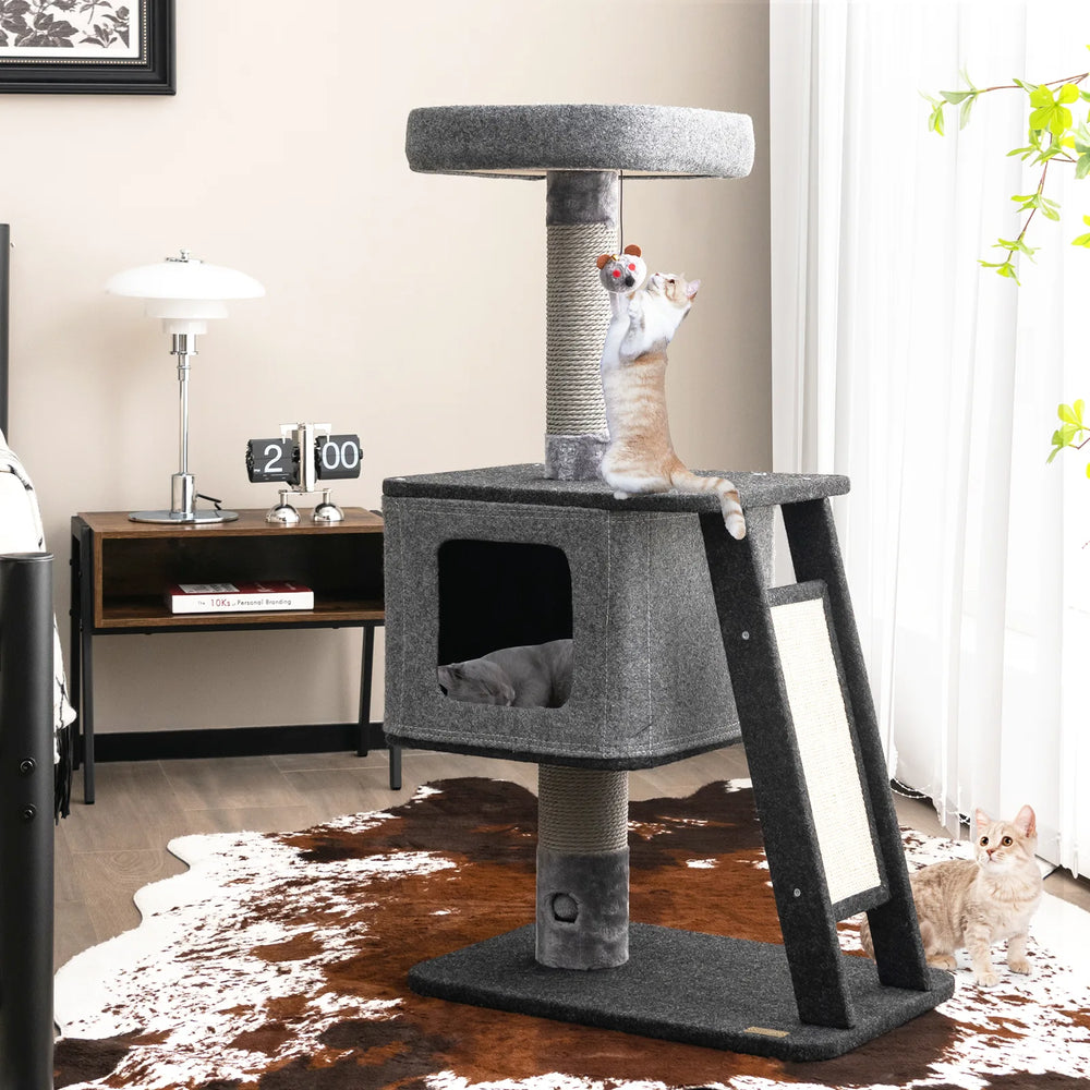 An Amusing Cat Entertainment Center for Your Lovely Cat! Our 3-layer cat tower measures 60 x 40 x 108 cm (L x W x H) and each layer can load up to 20 kg, which can be a perfect gift for your lovely kitten. The large condo with a plush cushion provides cats with a comfy sleeping place while protecting privacy, and the top perch with soft fabric filling allows your cat to enjoy the feeling of the top of the world. Besides, the scratching posts with sisal ropes covering can satisfy cats' instinct of scratching and climbing. The 2-in-1 scratching ramp with a sisal pad is convenient for cats to reach the second-floor condo while adding more climbing fun. Moreover, all platforms are covered by soft felt, which provides warm and comfortable touch for your kitten. And the weights of all columns and platforms are evenly distributed, so it would not easy to wobble or tipple over. Thanks to the elegant light-gray looking, this 3-layer cat tree can blend beautifully into all kinds of interior decor. Bullet Point: Multi-Layer Fun Center: The 3-layer cat tower is designed with a large condo and a top perch offering a luxurious and private napping experience, and a large scratching ramp for exercising. And there exists an amusing jingling furball for playing, making kittens' day full of fun and excitement. Scratching Posts & Ramp: The supporting posts are covered with durable sisal ropes that can satisfy your furry friend's need for scratching while protecting your furniture from destroying. Moreover, the ramp with sisal can not only allow cats to climb but also help them to grind claws. Soft Touch & Stable Structure: The top perch is covered by pet-friendly felt and filled with soft fabric, providing ultimate comfort and warmth. Besides, the raised rim on the top perch helps protect your kitten from falling. And thanks to the wide base and balanced design, the cat tree is safe and stable for kittens to jump up and down. Release Natural Instincts: The 4-layer structure meets cats' need to climb and seek different needs, and the top perch allows kittens to sit on, enjoying the sunbath and the outdoor scenery. This is an all-in-one cat activity center to rest, relax, climb, scratch, exercise, and play, so your lovely kitten would not feel bored when you are not at home. Stylish Appearance & Easy Installation: With the well-proportioned lines and modern gray colors, the modern cat tower can also be a perfect addition to your living room or bedroom. In addition, equipped with detailed instructions and clear illustrations, you can set up this practical cat tower easily. Features: Meets cats' need to relax, play, grind claws, exercise, sleep, and overlook The large condo with a comfortable cushion provides privacy for kittens to rest The top perch with a padded cushion, perfect height for enjoying the sunshine Cats can fight with the jingling ball for extra mental stimulation The 2-in-1 scratching ramp brings convenience for climbing and scratching The scratching posts with sisal ropes help kittens develop a good scratching habit The felt is easy to set up and take down by hook ad loop fasteners The wide base and sturdy columns ensure great stability and a large loading capacity Specifications: Colour: Grey Material: Felt, Particle Board Overall Dimensions: 60 x 40 x 108 cm (L x W x H) Size of the Cat Condo: 49 x 39 x 32.5 cm (L x W x H) Size of the Top Perch: 37 x 37 x 8 cm (L x W x H) Weight Capacity of Each Layer: 20 kg Net Weight: 12 kg Package Includes: 1 x Cat Tower 1 x User's Manual