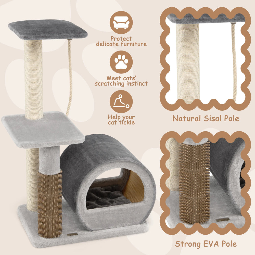 A cat climbing tree for cats and for your home! Are you troubled by the mess has made by your cat, our cat climbing tree will keep you away from these annoyances. With a plush top perch, a jumping platform, a hanging ball, and a cat house with a bamboo mat, the3 tier cat climbing tree caters to a variety of daily activities such as resting, jumping, playing, and provides a comfortable and relaxing experience for cats. In addition, the cat climbing tree has durable sisal posts and a EVA brush to fully satisfy the curiosity of cats, allowing them to groom and polish their paws, making them a sophisticated cat, as well as diverting their destructive power towards furniture. And this cat climbing tree has a stable structure with a square engineered wood base to ensure high load-bearing. Besides, its modern and concise design makes it a versatile home decoration. Bullet Point: Enjoyable Cat Playground: The cat activity tree comes with a top perch and a platform, which is ideal for cats to jump up and down or enjoy the distant landscape, making them have the feeling of being the king of the world. Besides, there are a teasing fur ball to engage your cats' curiosity, providing endless fun for them! Comfortable Rest House: Our cat tower features a large upgraded cat house, which is padded with a breathable and cool bamboo mat, allowing cats have a more restful sleep. In addition, the cat house is equipped with 2 large entrances for easy access or hiding for cats, while ensuring good ventilation. Cat Health & Massage Center: In order to fully release cat's instincts and divert their attention from your furniture, we have designed a tall and wear-resistant scratch post for cat to sharpen their claws. And there is a built-in grooming brush that allows cats to massage or tickle for a healthy and refined body. Superior Material for Cats: Both the top perch and platform is covered with soft plush, ensuring a skin-friendly and gentle touch for cats. In addition, the scratch posts and groom brush are made of natural sisal and environmental friendly EVA, which is chemical free and safely for cats to play for a long time. Stable Frame & Simple Frame: Constructed of solid engineered wood and supported by a large base, our multi-level cat tower is super sturdy to holds up to 20kg. And it has a simple structure for tool free assembly. Besides, its modern and concise design can blend well into various home decor as a cat furniture. Features: Soft wrapped top perch is ideal for cats to overlook the distant view Jump platform inspire cats to exercise to meet their active nature Dangling ball attracts cats' attention and gives them hours of fun Natural sisal post satisfy cat scratching nature and keep them away from furniture Large cat house with bamboo mat provide a comfortable sleep Built-in groom brush enables cats to massage or tickle Solid engineered wood base ensures good load bearing Quick to set up with clear instruction and simple structure Specifications: Colour: As the picture shows Material: EVA, Sisal, Bamboo, Engineered Wood Overall Dimension:56 cm x 40 cm x 92cm(L x W x H) Cat House Dimension:38 cm x 34 cm x 33cm(L x W x H) Top Perch Size:31 cm x 31cm(L x W) Platform Size:40 cm x 30 cm(L x W) Net Weight:8 kg Top Perch Maximum weight:10 kg Platform Maximum Weight:20 kg Package includes: 1 x Cat Activity Tower 1 x Instruction