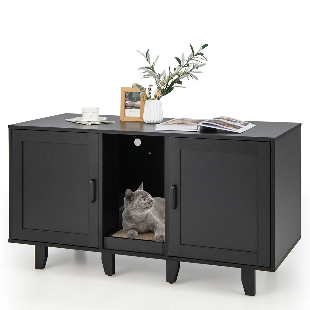 2-Door Cat Litter Box Enclosure with Winding Entry and Scratching Board-Black