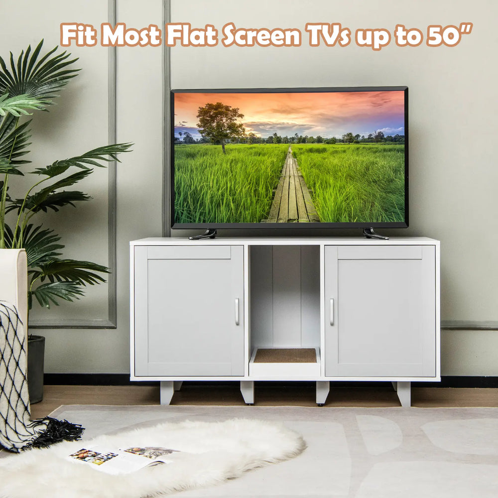 Provide a Comfortable Toileting Experience for Your Lovely Kitten! With the wide tabletop, the cat furniture can also be used as a TV stand that can hold TV screens up to 50". With 2 individual compartments, this hidden cat washroom is great for safeguarding your cats' privacy, allowing them to unleash their natural instincts. Cats can also enjoy scratching fun with the medium scratching board, effectively preventing them from scratching everywhere. In addition, it is equipped with 4 metal legs guaranteeing great stability and durability, and the metal legs can be detached for stacked storage. With its elegant and vintage appearance, the cat litter box furniture can be a perfect decoration and brighten your room. Bullet Point: 3-in-1 Multifunctional Cat Furniture: The multifunctional cat furniture cabinet can not only be used as a cat litter box enclosure or cat house to hide cat litter boxes or beds, but also as a TV stand, coffee table, or end table. And with its modern and chic appearance, the cat litter cabinet could perfectly blend into any home style. Provide Privacy: The hidden cat washroom can be a perfect spot for kittens to enjoy private potty time and allow them to find a sense of security and belongings in the enclosed environment. More than that, it can also be a good solution to prevent litter from being scattered everywhere and reduce unpleasant smells. Winding Entry & Scratching Board: The wooden cat furniture is designed with 2 compartments and winding entries, which can add fun for cats who love exploring while preventing the litter from being carried off the cabinet. Besides, there exists a removable scratching board for cats to grind their paws. Stable Structure & Stackable Design: The cat litter box enclosure adopts thick boards and 6 supporting legs, ensuring great stability and a large loading capacity (the tabletop loads up to 20kg and the interior 40kg). And there exist adjustable footpads for keeping stable even on uneven floors. Moreover, the supporting legs can be easily removed, so the cat furniture can be stacked to meet different needs. Ample Storage Space: The wooden cat litter cabinet is designed with 2 compartments that allow 2 cats to use the cat washroom simultaneously, and each compartment measures 41 x 50.5 x 51 cm( L x W x H). Notice: Please measure the size of your cat litter box before purchase. In addition, the wide tabletop measure 120 x 52 cm(L x W), which can fit most flat TV screens up to 50". Features: Can be used as a cat litter box enclosure, side table, TV stand, coffee table, etc The spacious tabletop can be used for putting TVs, decors, cat supplies, etc Provide privacy and save you from the trouble of scattered litter and offending smells The winding entry allows cats to move from one divider to another divider The scratching board protects furniture from scratches, easily removed for cleaning Thick boards and supporting legs ensure excellent sturdiness and stability 6 wooden legs can be detached, the cabinets can be stacked for space-saving storage The adjustable footpads enhance stability while preventing slipping 3 ventilated holes promote air circulation and keep the interior clean and fresh The veneered boards are smooth, scratch-resistant, and waterproof for easy cleaning Specification: Color: Gray Material: PB, MDF Overall Dimensions: 120 x 52 x 65 cm (L x W x H) Size of the Compartment: 41 x 50.5 x 51 cm (L x W x H) Weight Capacity of the Tabletop: 20 kg Weight Capacity of the Interior Board: 40 kg Net Weight: 27 kg Package Includes: 1 x Cat Litter Box Enclosure 1 x User's Manual