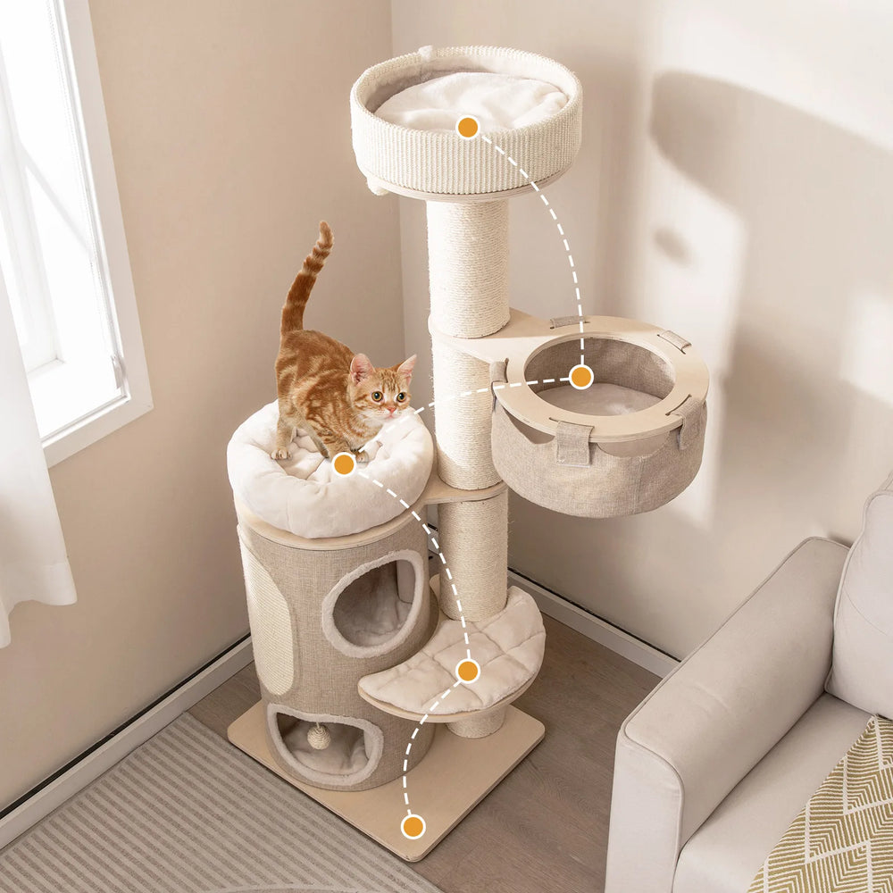 Treat your cats to the best with the cat tree climbing frame! The versatile cat tree features a top perch, a large hammock, a plush wrapped bed and 2-storey condo, providing ample space for cats to sleep or rest. The 2-tier condo features wear-resistant faux linen fabric, adding a touch of style to your space. Additionally, the inside removable cushions are hand washable and machine washable, ensuring coziness and extra comfort. Moreover, the top perch and condo are equipped with sisal carpet, providing versatile scratching options. And the natural sisal wrapped scratching posts are built to protect your furniture. To stimulate cats' hunting instinct, there are 2 dangling ball to keep them entertained. With a wide base and smooth round corners, your furry companions can jump up and down safely. Bullet Point: Multifunctional Paradise for Cats: The all-in-one cat tree features a top perch, a faux linen fabric hammock, a removable bed and a 2-storey condo, providing ample space for cats to take a nap or overlook the world, which is suitable for family with multiple cats. Additionally, the 2 fur balls enable cats to play to their heart's content. Deluxe and Cozy 2-tier Condo: Crafted with wear-resistant faux linen fabric and cool bamboo mat, the 2-tier condo offers breathable experience for your cats while ensuring long-lasting use. Featuring a platform and 2 large entries, your furry companions can easily access their favorite spot. Multiple Outlets to Release Instincts: Coming with 14 cm thickened scratching posts that are fully wrapped by tough and scratch-resistant sisal, the tall cat tower will save your furniture. What's more, the top perch and condo feature sisal carpet to further encourage cats to scratch. Comfort Meets Easy Maintenance: Each layer of the modern cat condo furniture is equipped with a removable cushion. And the removable bed is wrapped by plush, offering soft touch for felines to snuggle. Both the cushions and bed are machine washable, making maintenance a breeze and ensuring a fresh environment. Stable and Safe Construction: Designed with a large base and protective round corners, the multi-level cat play center ensures your furry companions to play or jump safely without any risk of injury. Moreover, the 6 non-slip pads will keep your floor from unwanted damage.
