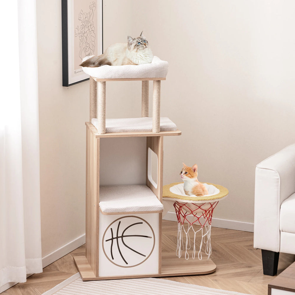 47 Inches Wooden Cat Tree with 2-Story Cat Condo and Basketball Hoop Hammock-Natural