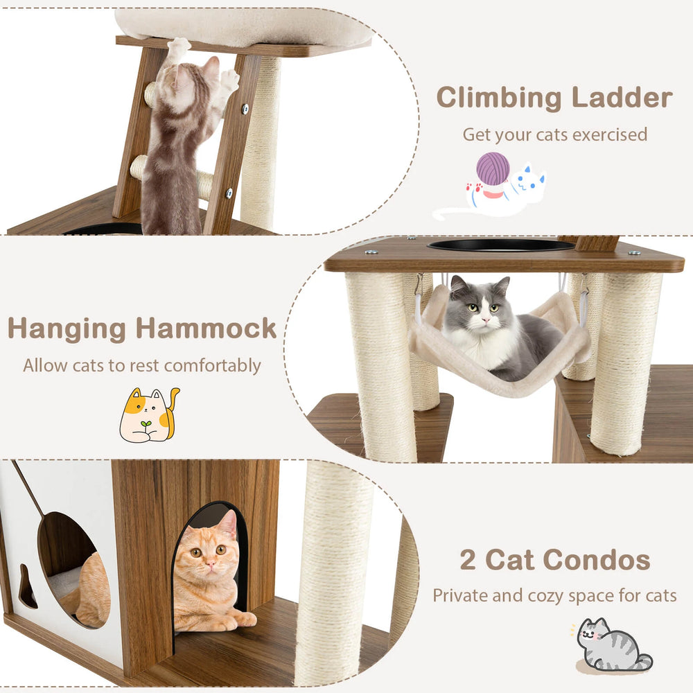 Color Natural Material Sisal, Plush, MDF, Engineered Wood Overall Height 57" Size of Top Perch 17.5" x 17.5" Size of Climbing Ladder 11" x 7.5" Diameter of Entrance to Hammock 9" Size of Hammock 10.5" x 9.5" Size of Platform 15" x 11" Size of Each Condo's Entrance 7" x 9" Inner Size of Each Condo 13" x 12" x 15" Size of Base 27" x 15" Load Capacity of Hammock 22 lbs Load Capacity of Each Layer 33 lbs Net Weight 49.5 lbs