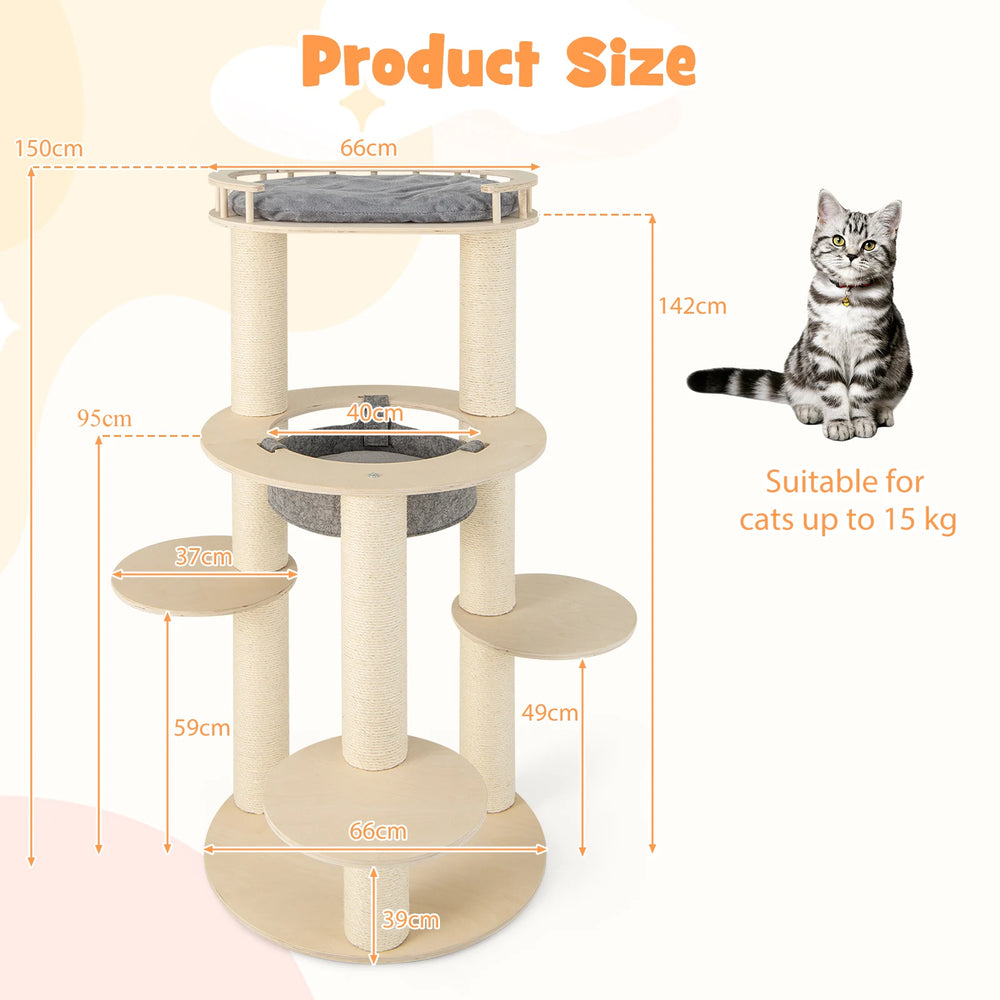 Specifications: Color: Grey + Natural Materials: Sisal, Non-woven Fabric, Solid Wood, Plush, Plywood Overall Dimension: 66 x 66 x 150 cm(L x W x H) Hammock Size: 40 x 10 cm(Dia. x H) Round Platform Diameter: 37 cm Scratching Post Diameter: 11 cm Net Weight: 19.5 kg Each Layer Weight Capacity: 15 kg Package Includes: 1 x Cat Tree 1 x User’s Guide