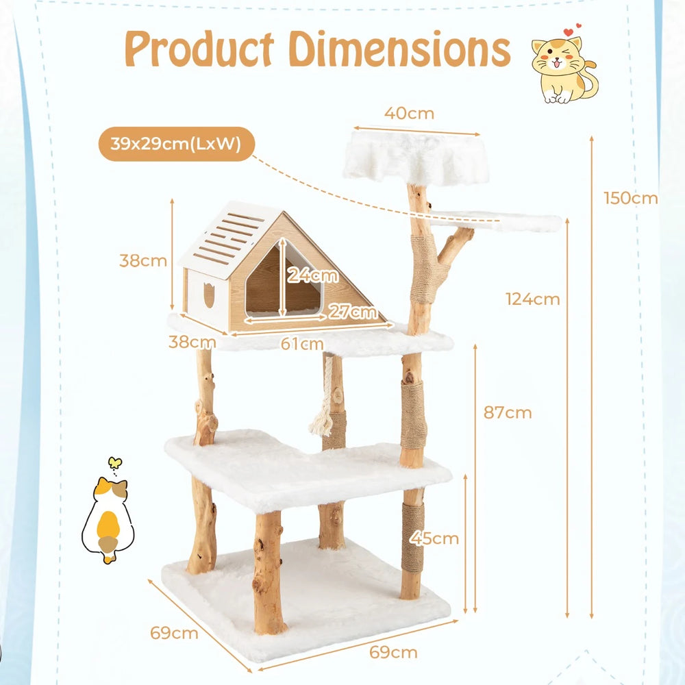 This exquisitely crafted cat tree features natural pear wood trunks that exhibit unique grain patterns, which not only enhance the aesthetic appeal but also ensure a stable and secure structure for your cat to explore and play on. It comes with a house-shaped cat condo for private napping, 2 perches for observing the surroundings, and 2 spacious platforms for stretching out and lounging. For encouraging healthy scratching habits, our cat tree boasts natural jute scratching posts and a hanging sisal rope, which could also keep your cats engaged and entertained. Other than that, each platform is covered with 800 G/M2 high-quality long plush fabric, offering unparalleled softness and comfort for your cat's relaxation. Give your beloved pet the gift of a natural and fun-filled sanctuary with this solid wood cat tree! Bullet Point: Natural Solid Wood Trunks: The cat tree boasts real natural pear wood trunks that are deformation-resistant and reliable, providing a safe and stable structure. Moreover, each trunk features distinctive grain patterns, making every cat tree a one-of-a-kind piece.Multiple Resting Spots: The wooden cat tree offers a variety of cozy spots for cats to relax, play, and observe their surroundings, including a private house-shaped cat condo, 2 cozy top perches, and 2 large platforms. There are 5 layers for your furry friends to climb up and down. Luxurious Comfort: Each platform is enveloped in 800 G/M2 high-grade long plush fabric, offering a luxuriously soft touch that pampers your furry companion. The cozy texture provides a warm and inviting space for your cat to curl up, nap, or play.Fulfill Scratching Needs: The solid wood cat tower is equipped with jute scratching posts and a hanging sisal rope, allowing cats to grind claws and release instincts. Moreover, they are crafted of natural jute and sisal, which are scratch-resistant, wear-resistant, safe and healthy.Considerate Details: The cat climbing furniture features sealed edge design at the entrance of the condo to prevent fur from sticking, and there are ventilated holes on the condo roof, providing a clean and hygienic environment for your furry friend. Additionally, the cushion of the top perch is removable, making cleaning a breeze. Features: Each natural pear wood trunk is unique in shapes and patternsThe solid wood trunks provide excellent durability and sturdinessComes with 2 cozy top perches for cats to relax and overlookComes with 5 tiers and 2 large platforms, provide multi-layer funComes with a large cat condo for your furry friends to hide, play, and sleepThe jute scratching posts allow kittens to release the scratching urgeThe posts are covered by natural jute ropes, safe, reliable, pet-friendlyThe hanging sisal rope encourages playfulness and exerciseCovered with long plush fabric, pamper your cat with its softness and warmthThe condo roof features a ventilated design, make the inside breathable and comfyThe top perch features a removable cushion, easy to maintain
