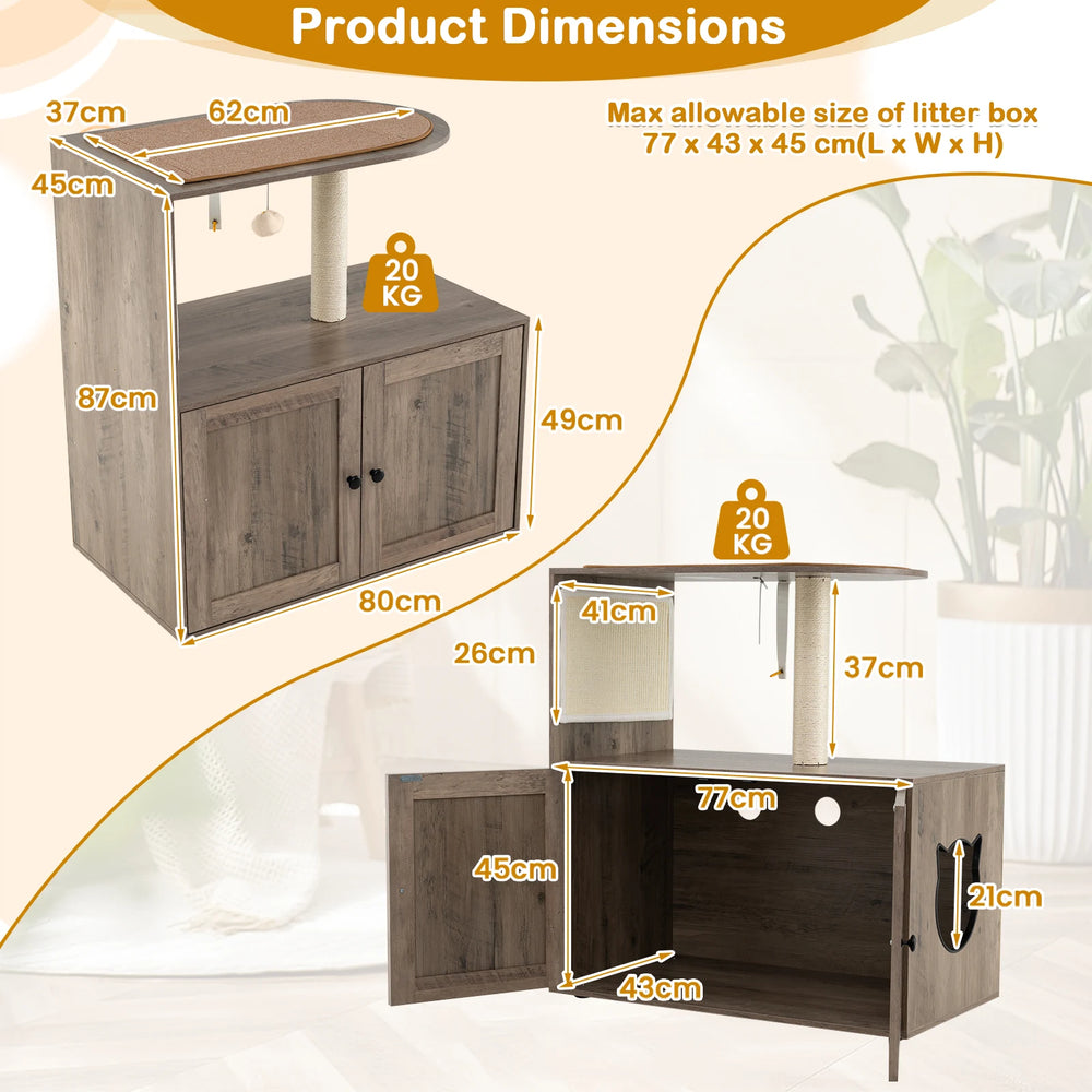 Our multipurpose cat furniture seamlessly integrates a small cat tree and discreet litter box enclosure into a sleek design. The bottom cabinet serves not only as a hidden cat washroom for privacy and odor control, you can also add a cat bed for private resting, or store food and pet supplies, keep your space well organized. Moreover, the cat tower comes with a sisal scratching post and mat for cats to grind claws, complete with a plush ball with a bell adds extra fun, keeping your furry friends entertained and engaged. The large top perch with a soft mat provides a spacious and comfortable resting area for lounging and overlooking. For enhanced stability and security, our cat cabinet is equipped with an anti-toppling device and adjustable footpads, keeping both your pet and family safe from accidents. Our reliable cat tree with litter box enclosure is designed to create a happy and healthy space for your beloved pet! Bullet Point: 2-in-1 Cat Furniture: This wooden cat furniture measures 80 x 45 x 88 cm (L x W x H), which combines a small cat tree and a cat litter box enclosure, saving floor space. The bottom multipurpose cabinet serves not only a hidden cat washroom but also a cat house or storage cabinet. Enhanced Privacy: This hidden litter box enclosure offers private space for kitten potty time, allowing cats to find a sense of security and belongings in the enclosed environment. It could also be a good solution to reduce unpleasant smells and reduce litter tracking. Add More Fun: The cat tower is equipped with a fully-wrapped sisal scratching post and a large sisal scratching mat, allowing cats to grind their claws. Furthermore, there is an interactive plush ball with a bell, offering your furry friends endless hours of enjoyment and exercise. Stable and Safe Construction: Adopting an anti-toppling device, the cat cabinet can be securely fixed on the tree, preventing accidental tip-overs when cats climb up and down. Furthermore, it is equipped with adjustable footpads, keeping stable even on slightly uneven floors. Comfy Resting Experience: Featuring a large top perch with a soft mat, the cat cabinet is also ideal for rest and relaxation. The mat is easy to detach, complete with waterproof veneered boards, making cleaning a breeze and ensuring a hygienic space for your cat to lounge. User-Friendly Details: The back panel comes with ventilated holes to keep the interior fresh, while the side cat hole with sealed edges prevents cat hair from sticking, maintaining a clean and tidy environment.Note: The maximum allowable size of litter box is 77 x 43 x 45 cm (L x W x H). Please measure the size of the cat litter box before purchase. Features: Combines a cat tree with a discreet litter box enclosure, versatile and functionalThe cabinet serves as a cat litter box enclosure, cat house, or a storage cabinetThe double-door cabinet offers privacy while hiding the mess and odor The scratching post and mat allow cats to grind claws and release instinctsThe scratching surfaces are made of natural sisal, resistant to scratch and wearThe interactive plush ball with a bell provides physical and mental stimulationComes with a spacious top perch for cats to lounge and observe their surroundingsThe top perch comes with a cozy mat, which is detachable for easy cleaningEquipped with an anti-toppling device, keep the cabinet stand still, prevent wobblingEquipped with adjustable footpads, ensure stability on various surfacesThe back panel features ventilation holes to ensure air circulationThe cat hole features sealed edges is not easy to stick to cat hairsThe cabinet adopts magnetic catches, keep the doors securely closed Specifications: Color: Gray+WhiteMaterial: Engineered Board, MDF, SisalProduct Dimensions: 80 x 45 x 88 cm (L x W x H)Maximum Allowable Size of Litter Box: 77 x 43 x 45 cm (L x W x H)Size of the Top Perch Mat: 62 x 37 cm (L x W)Weight Capacity of the Top Perch: 20 kgWeight Capacity of the Middle Layer: 20 kgWeight Capacity of the Bottom Cabinet: 40 kgNet Weight: 17 kg Box qty: 1 Package Includes: 1 x Cat Tree with Litter Box Enclosure 1 x Users Manual