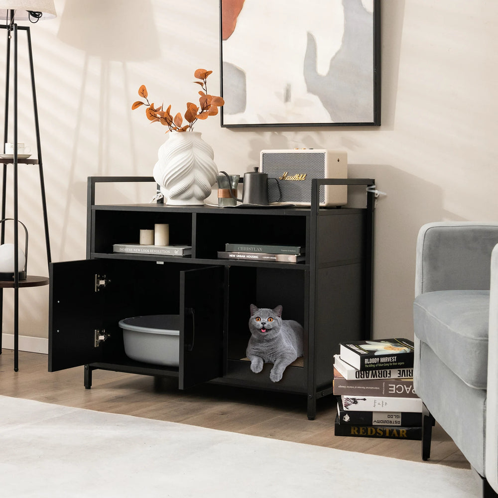Wooden Cat Litter Box Enclosure with Compartment and Scratching Board-Black