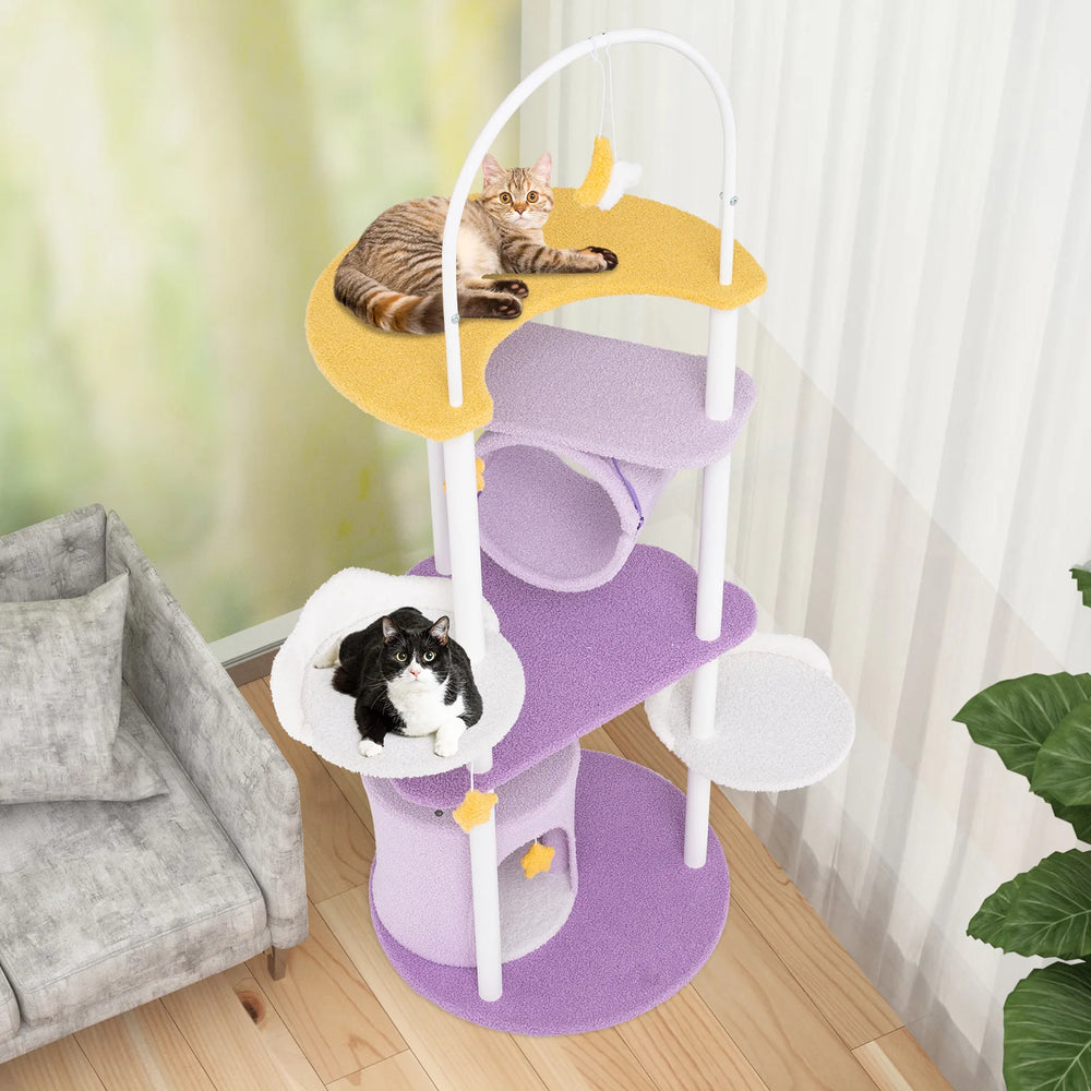 Color White, Purple & Yellow Material Engineered Wood, Teddy Fleece, Metal Overall Height 62" Base Diameter 24" Cat House Size 13" x 14" Weight Capacity of Each Layer 22 lbs Weight Capacity of Hammock 11 lbs Net Weight 34 lbs
