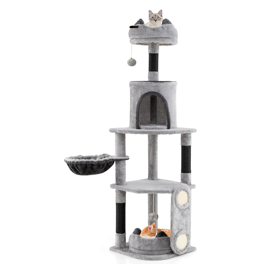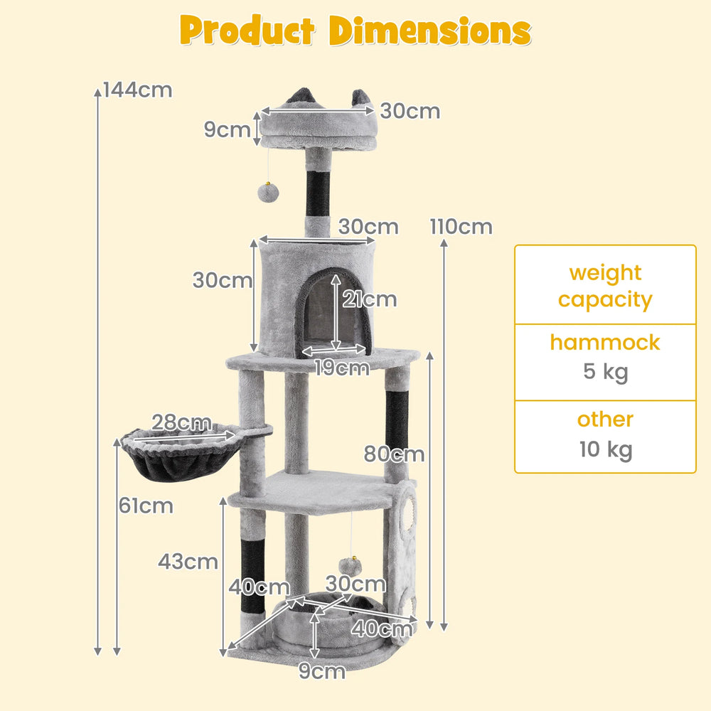 Colour: Grey & Black Material: Engineered Wood, Sisal, Polyester, PP Fiber Overall Height: 144 cm Base Size: 40 cm x 40 cm(L x W) Cat Condo Size: 30 cm x 30 cm (Dia x H) Plush Perch Diameter: 30 cm Weight Capacity: Hammock: 5kg; Other: 10kg Net Weight: 10 kg Box Qty:1 Package Includes: 1 x Cat Tree 1 x Anti-tipping Device 1 x Instruction