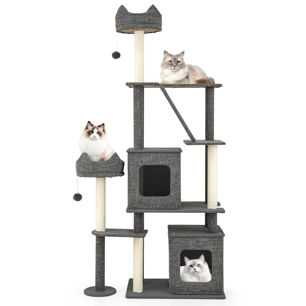 Our large and tall cat tree measures 86 x 40 x 180 cm (L x W x H), which not only serves as a fun activity center for your pets but also enhances your home decoration, adding a touch of sophistication to your living space. Designed with both fun and function in mind, the tree features a solid base reinforced with an anti-toppling device and an additional support post to ensure stability during even the most vigorous play. Cats can leap and bound across 7 levels of fun, or snuggle into one of 2 condos with detachable walls, each offering a private and cozy retreat. The pinnacle of comfort is achieved with a top perch, side bed, and padded platforms, cloaked in breathable and skin-friendly fabrics, making it inviting throughout the year. Further indulging your cats instincts, this tree includes 4 scratching posts and a 2-in-1 sisal scratching board and ladder that not only entertain but also keep their claws healthy. To top it off, plush hanging balls with tinkling bells offer endless entertainment, making this cat tree a must-have for ensuring your pets are happy, active, and secure in their luxurious playground. Bullet Points:Multiple Resting Spots: This 180cm tall cat tree comes with 2 comfortable cat condos for private napping, a cozy top perch for sunbathing, and a snug side cat bed for curling up in comfort throughout the day. It not only serves as a playground for your furry friends but also doubles as a stylish home decoration piece. Enhanced Playtime: Equipped with 4 fully-wrapped scratching posts, complete with a 2-in-1 sisal scratching board and ladder, the cat tower is designed to encourage natural scratching habits while protecting your furniture. Moreover, it includes 2 plush dangling balls with bells to keep your cats entertained and active. Enhanced Stability and Safety: The cat furniture is designed with an anti-toppling device to secure the tree on the wall, enhanced by a large base with an additional supporting post, providing a secure and stable environment for your cats to climb, jump, and play without any risks of tipping over. Comfy Lying Experience: The skin-friendly and breathable fabric covered on the jumping platforms provides pleasant and hair-resistant resting surfaces, while the scratch-resistant linen fabric on other sections provides cool and comfy surfaces for year-round use. All platforms are padded, treating your cats to ultimate comfort. Detachable Condo Covers: The walls of 2 condos are connected by hook and loop fasteners, making them easily detachable. This feature enhances ventilation, simplifies cleaning, and satisfies diverse needs. Additionally, the cat tree is designed with 7 layers for cats to climb up and down, providing multi-layer fun.