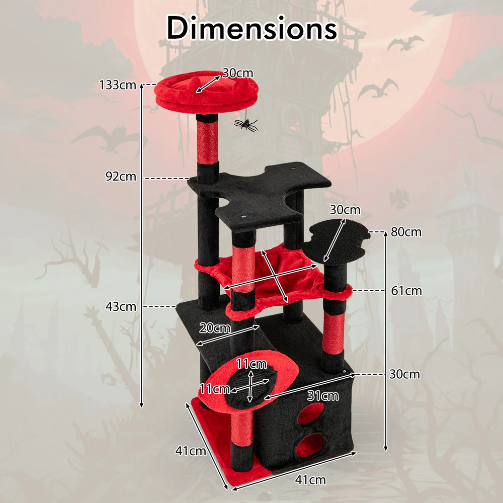Color: Black & Red Material: Sisal, Plush, Particle Board Overall Height: 133 cm Base Size: 41 x 41 cm(L x W) Plush Perch Diameter: 30 cm Condo Size: 41 x 31 x 30 cm(L x W x H) Entry Size: 17 x 20 cm(L x H) Each Layer Weight Capacity: 10 kg Net Weight: 9 kg Box QTY: 1(May vary by batch) Package includes: 1 x instruction