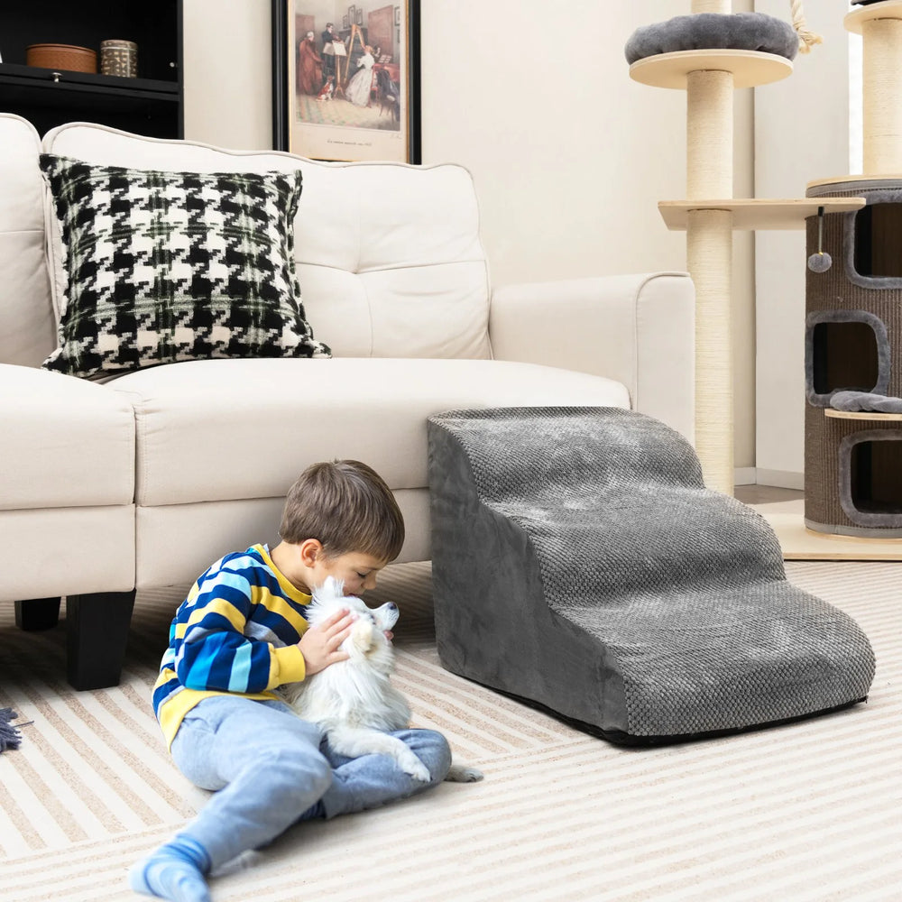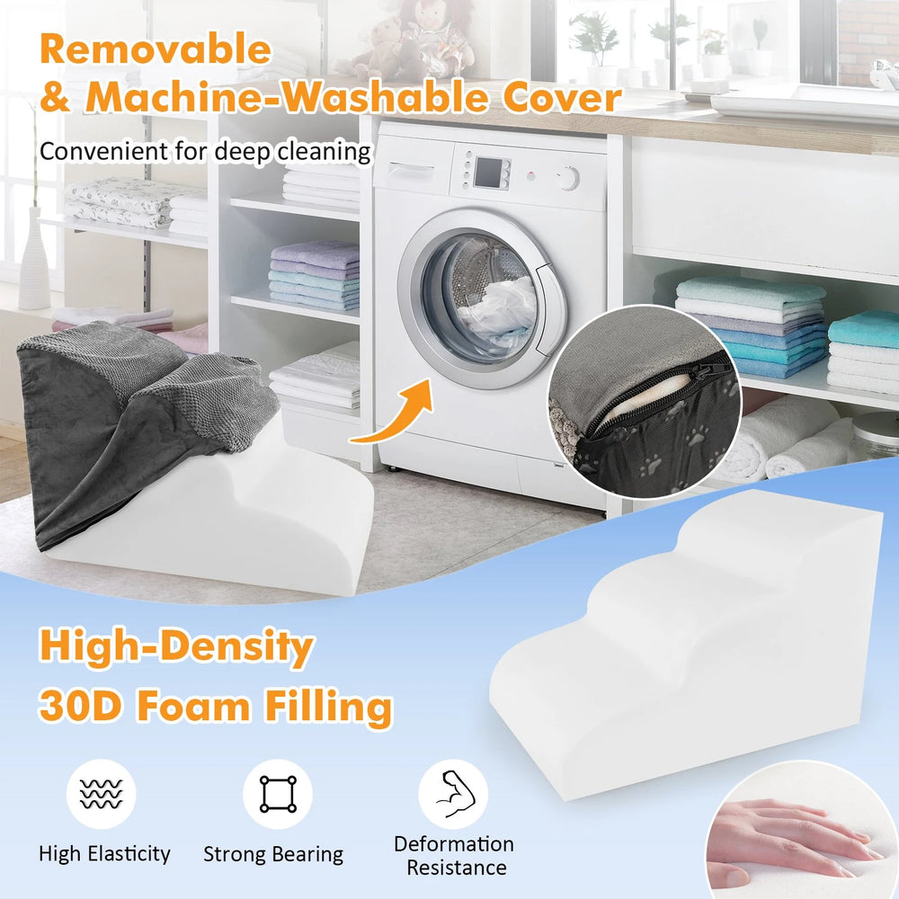 Give Your Furry Friend a Soft Ramp, Easily Climb to Their Favorite Place! Our 3-tier foam dog ramp measures 58cm x 42cm x 40cm(L x W x H) and loads up to 30kg, which is suitable for short-legged dogs or pets who suffer from arthritis, joint stiffness, or other mobility impairments, allowing them to climb up or go down the bed, sofa, or stool at will. The pet stairs ladder is filled with thick foam with high resilience and strong support, which is not easy to deform. And it is covered by premium suede fabric to improve friction, so the pet would not slip when moving on it. Moreover, the bottom cloth with silicone paw prints can also add friction to prevent the ramp from moving, ensuring safety during use. The ramps cover is equipped with zippers that allow you to detach the cover for cleaning, and it is machine washable. Special Notice: Our pet ladder is packed in a vacuum compression package, and it may take some time (48 hours or more, depending on the ambient temperature) to completely rebound. Bullet Point: Gentle and Wide 3-Tier Steps: Unlike other steep and narrow steps, our 3-step foam pet ramp will provide greater traction for your furry friends, helping them safely reach desired destinations such as high beds, couches or floating windows, making it an ideal gift for pets with joint injuries or limited mobility. Stable & Comfortable Support: The main body of the foam pet ramp is made of 30D high-density foam, which is extremely elastic and non-deformable, ensuring that your pet is comfortable and stable when stepping on it. In addition, our pet ramp can support a weight of 66 lbs, suitable for small and medium-sized pets. Upgraded Non-slip Design: For higher stability, we have designed a non-slip silicone paw print at the bottom of the extra wide pet stairs to increase the friction with the ground and avoid it from shaking during use. Moreover, the grained surface provides greater traction to prevent pets from slipping when moving. Durable & Washable Cover: Equipped with a suede cover, our pet ramp features gentle touch to ensure a cozy and soft experience for pets. Meanwhile, the high-quality suede is wear-resistant and not easily damaged by your pet's sharp claws. Moreover, the cover is zippered for easy detachment and cleaning. Easy to Setup & Move: The 3-tier pet step is packed in vacuum compression, which will be fully rebounded within 48 hours, please let the foam fully contact with air after opening the package. And our foam pet steps are ultra-lightweight, so you can easily move them around the room to meet different usage needs. Features: The high-density foam filling provides ultra-soft touches, not easy to deform, durable The non-slip suede fabric surface ensures excellent stability and safety when climbing The zippered suede fabric cover can be easily detached for daily cleaning The bottom cloth with silicone paw prints prevents slipping or tipping over Adopts a gentle arch slope and wider steps, protecting pets knees and legs Without any corners or edges, prevent hurting from accidental collisions The bottom cloth features a variety of silicone paw prints, adding friction Adopts vacuum compression packing, keeps the sponge in good condition during transportation Suitable for small dogs, old pets, mobility-impaired pets, or short-legged dogs Specifications: Colour: Coffee/Grey Material: Suede Fabric, Sponge Overall Dimensions: 58cm x 42cm x 40cm (L x W x H) Height of Each Step: 14cm/27cm/40cm Weight Capacity: 30kg Net Weight: 2kg Package Includes: 1 x 3-Tier Foam Dog Ramp 1 x Users Manual 1 x Pet Hair Remover