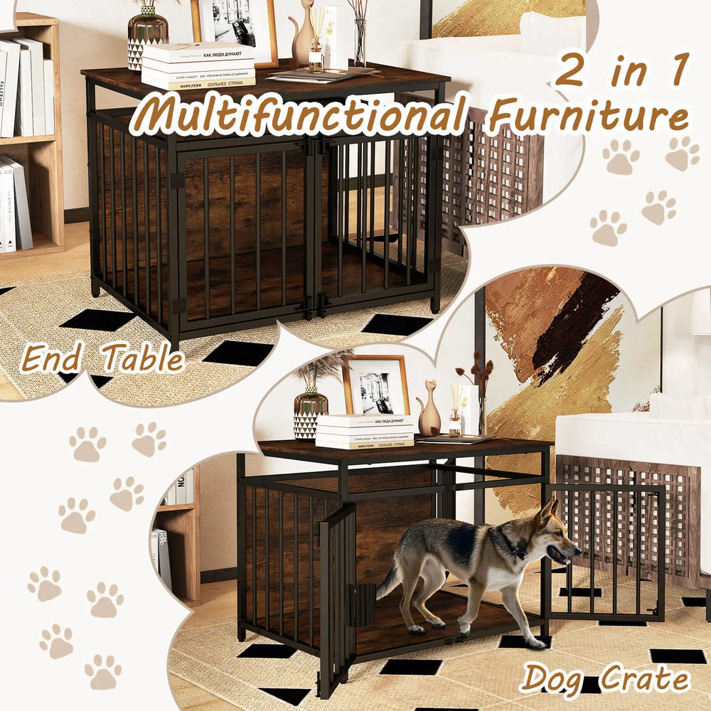 With 3-sided metal walls, the dog crate furniture combines durability with ventilation. Unlike others with deformable and fragile metal wire, this features thickened metal tubes, which are sturdy and chew-resistant. Considering that dog may easily get stuck on the bottom of mesh grid, we adopting enclosed base to provide a solid foundation for felines. Also, the double-locked doors keep your pets from escaping out of your sight. Dogs have the freedom to enter or exit from any side they prefer. Therefore, the decorative pet crate features a side door that can be installed at left or right side as needed. Featuring a large tabletop, the dog cage can serve as an end table to display your favorite decorations. Furthermore, there are exquisite details to impress you. For the feline lovers, the top hollow-out design opens up a world of interaction with your dogs. Plus, the adjustable foot pads will ensure stability on uneven floors. Heavy-duty Structure: Made of heavy duty metal tubes with a diameter of 12 mm, the side walls are designed to withstand even the most vigorous chewing. Moreover, the 3-sided metal wall ensures excellent ventilation and clear visibility, enabling you to observe your felines at any time.Secure and Convenient Access: The dog cage's three doors are equipped with two latches for enhanced security, preventing your pet from escaping while still providing the option to enter or exit from any desired side.Practical 2-in-1 Design: With a extra wide desktop, the heavy duty dog house offers ample space to showcase your photo frames, lamps, magazines, etc. Thus, a pet house is not only a kennel, but also a bedside table in the bedroom or a sofa side table in the living room.Considerate Details: Thanks to the innovative hollow design on the top, the rustic door crate allows dog owners to feed or interact with their furry companions conveniently. To enhance the stability and protect the floor, the decorative dog house features adjustable foot pads to prevent wobbling.Rustic Style and Proper Size: Featuring retro wood grain on the top, the dog kennel can seamlessly fit your indoor decoration. Measuring 80 cm x 60 cm x 64 cm(L x W x H), the decorative pet crate is suitable for most small and medium sized dogs. Please measure the body height and body length of your dogs before purchase.