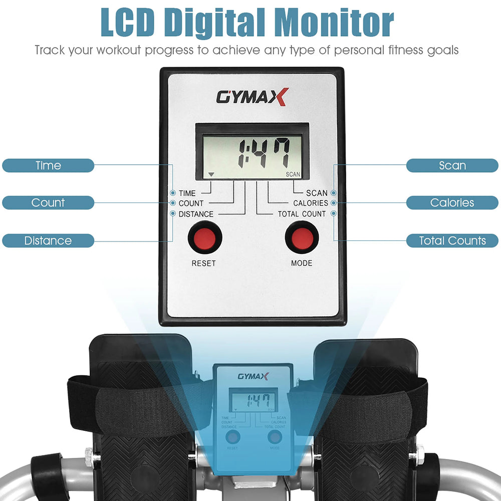 Material: Aluminum iron + steel + PU Color: As the pictures shown Weight limit: 110 lbs Dimensions: 42.5" x 33" x 8" ( L x W x H ) Net weight: 30 lbs Package includes: 1 x Rowing machine 2 x AAAbatteries 1 x Manual