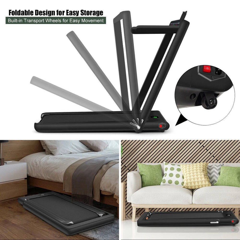 Material: ABS Overall Dimension: 124 x 68 x 106cm (L x W x H) Folding Dimension: 132 x 68 x 12cm (L x W x H) Running Area Size: 100 x 40cm (L x W) Net Weight: 34kg Weigh Capacity: 100KG Peak Motor Power: 0.75HP Speed: 1.0-12.0 km/h Control Method: Touch Button, Controller Package includes: 1 x 2 in 1 Folding Treadmill 1 x Remote Control 1 x Phone Holder 1 x Safety Key 1 x Power Cord 1 x Manual Instruction