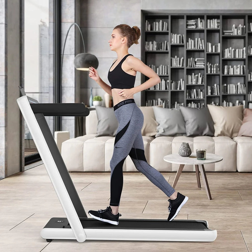 Material: ABS Overall Dimension: 124 x 68 x 106cm (L x W x H) Folding Dimension: 132 x 68 x 12cm (L x W x H) Running Area Size: 100 x 40cm (L x W) Net Weight: 34kg Weigh Capacity: 100KG Peak Motor Power: 0.75HP Speed: 1.0-12.0 km/h Control Method: Touch Button, Controller Package includes: 1 x 2 in 1 Folding Treadmill 1 x Remote Control 1 x Phone Holder 1 x Safety Key 1 x Power Cord 1 x Manual Instruction