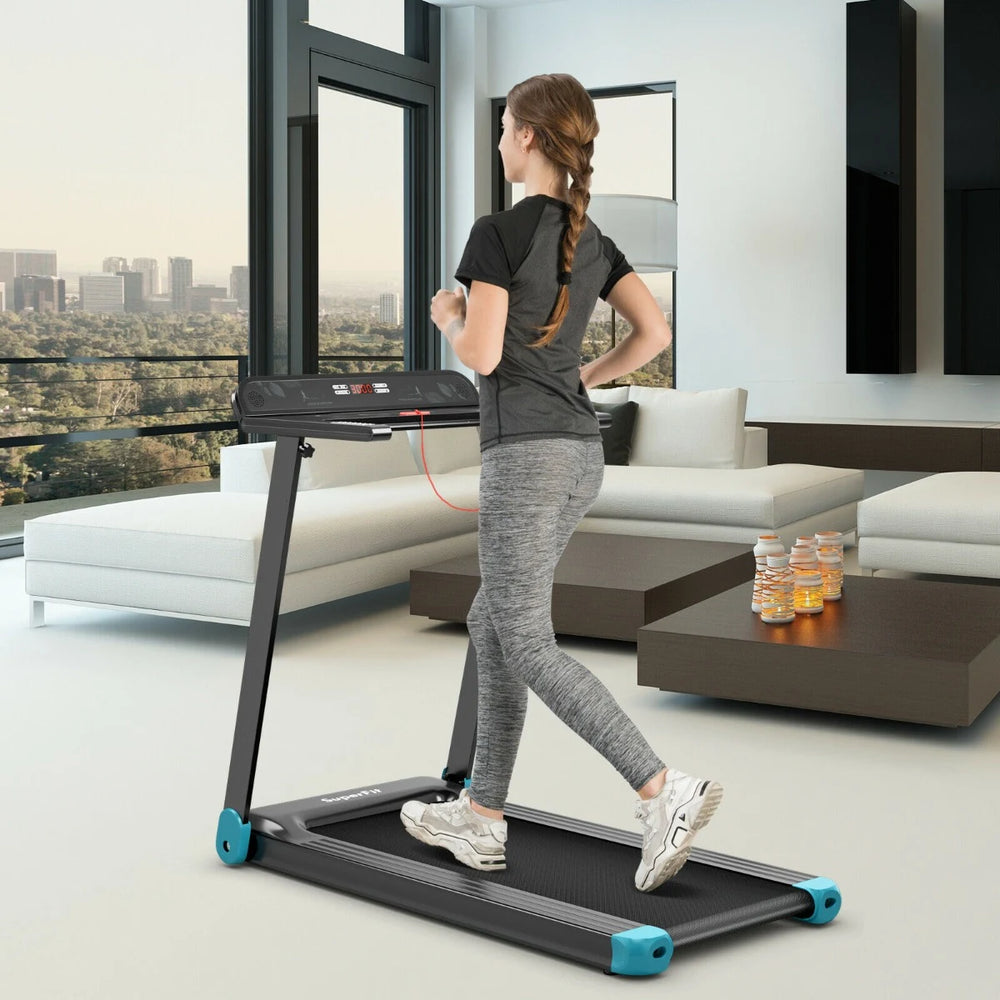 This compact folding treadmill is designed for home workouts where space is limited. Its fold-flat profile and two built-in transport wheels make it simple to move and store, while the LED display keeps your time, speed, distance, calories and heart rate visible during exercise.