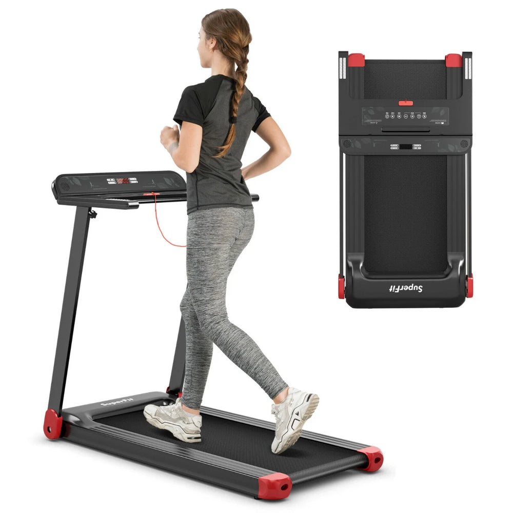 - Space-saving folding design folds to a slim profile so the treadmill can be stored upright or under furniture when not in use.