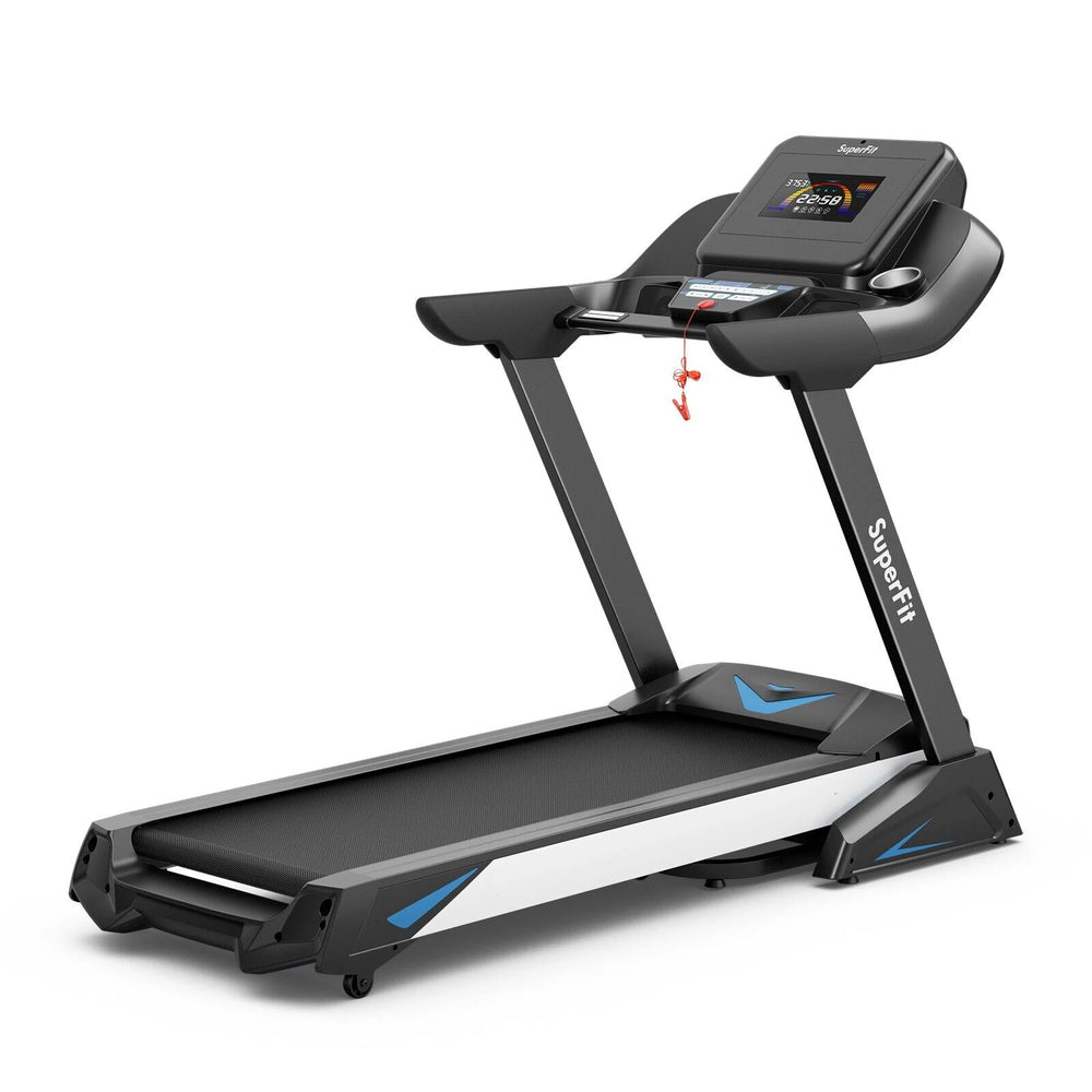 Having trouble going out to the gym? You can fulfil your training program at home with this upgraded folding treadmill! The exercise machine is professionally designed with 20 preset programs, which are suitable for different user groups of different levels. And thanks to the powerful 1.75HP motor, the treadmill can offer a wide speed range of 0.6-12 mph. Moreover, the running belt with 15-level auto-incline feature can further satisfy your need for strengthened training. You can easily achieve these functions through the shortcut buttons as well as the Bluetooth-connected APP. In addition, the smart machine will track your exercise data and display them on the LED screen. Thus, you can have a clear mind of your progress and make timely revisions to your workout plan. What's more, the design of the Bluetooth speakers will make the running time much more delightful and enjoyable. Last but not least, the foldable jogging machine can save a lot of space. Shock and Noise Absorption Running Belt: Powered by 1.75HP high-quality motor, the wide belt runs steadily to give you a better experience. In addition, the multi-layer belt integrated with wear-resistant surface, shock & noise absorption layer and high-strength base can protect your knees and prevent disturbing others. Auto Incline and Intelligent Running Programs: If you want to adjust the workout intensity, you can adjust the speed (0.6-12 mph) or the incline angle (1-15%) of the running belt, shifting between walking, jogging, running and climbing. What's more, there are 20 preset programs for you to choose from, so that you can customize your workout plan and run at your own pace. Large LED Display and APP Control: The exercise machine features a large LED screen to display data on time, distance, steps, calories and pulse. If you'd like a rest, you can press the PAUSE key to reserve the data. And there are also shortcut buttons for speed, incline and volume adjustment. Or you can also connect to the fitness APP via Bluetooth for memory data, goal setting and course selection. Innovative Folding Mechanism: Designed for the home gym, the treadmill can be folded up to save space when not in use. Besides, the transportation wheels make it a breeze to move the machine around. And if you want to use it again, just kick the hydraulic tube slightly to slowly lay down the running belt. Thoughtful Details for Safety and Fun: The folding treadmill is equipped with 2 pulse sensors and a safe key to track your heart rate and keep training security. If you'd like more fun, you can put your pad or phone in the groove or listen to music with Bluetooth speakers. And drinks are always available since there is a built-in cup holder.