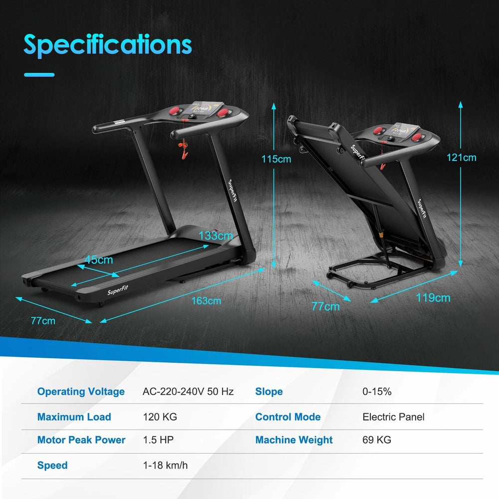 Colour: Black Material: Steel, MDF Dimension of unfolding: 163 x 77 x 121 cm (L x W x H) Dimension of folding: 119 x 77 x 115 cm (L x W x H) Size of running belt: 133 x 45 cm (L x W) Length of power Cord: 120 cm Net weight: 69 kg Weight capacity: 120 kg Speed range: 1-18 km Slope range: 0 - 15% Voltage: 220-240V/50Hz Package includes: 1 x Treadmill 1 x Silicone oil 1 x Instruction manual