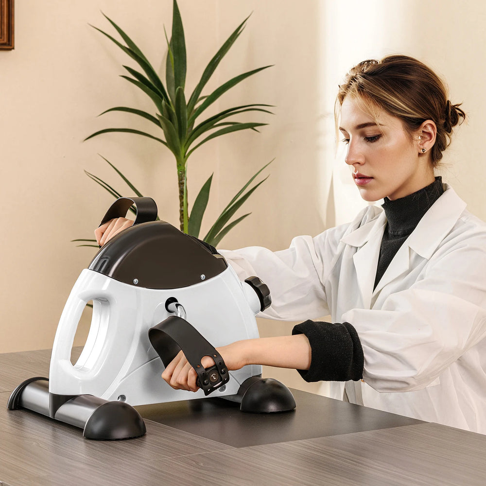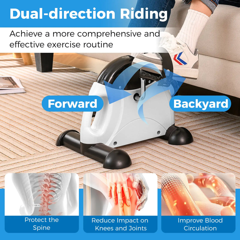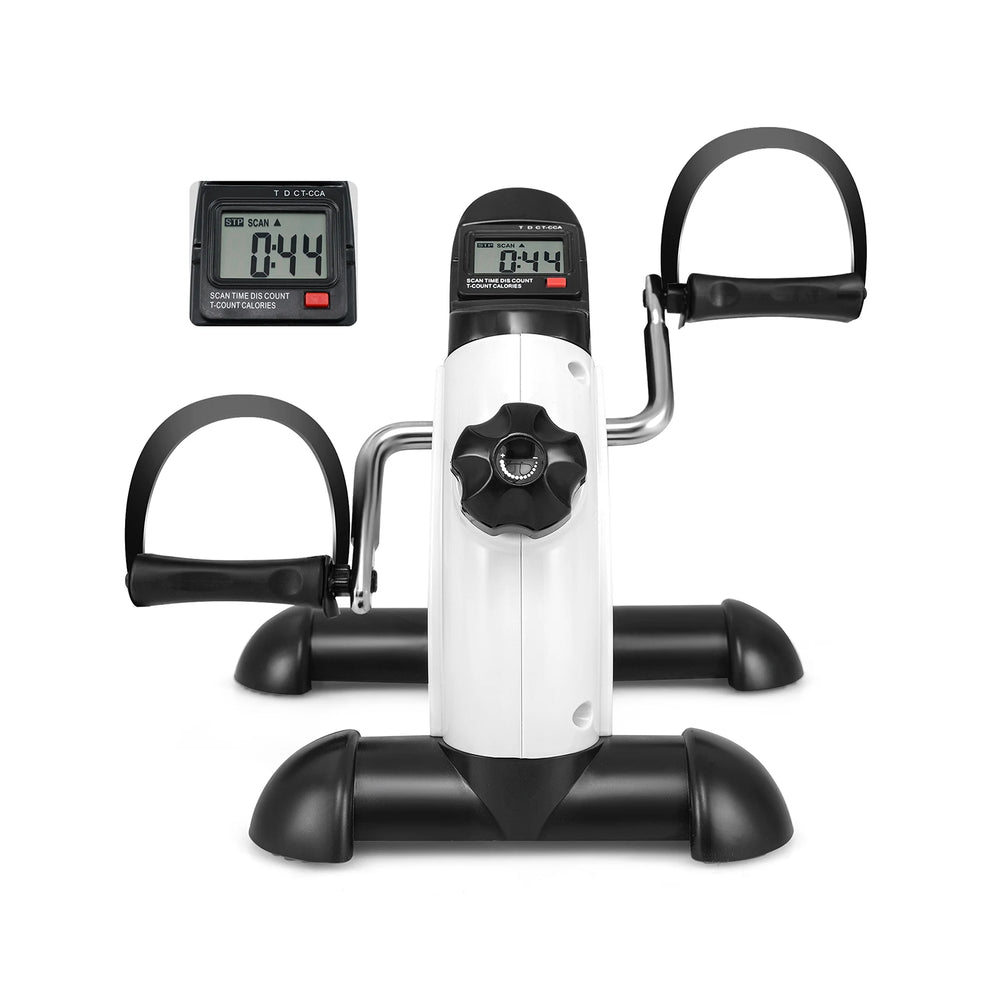 Its compact design includes a handle for effortless transport, fitting easily under the desk or on the table. Whether rehabilitating post-surgery or seeking a safe exercise for the elderly, the adjustable tension and dual-direction pedaling enhance customization and effectiveness. In addition, this foot pedal exerciser tracks your progress on the clear LCD display, which monitors time, distance, count, total counts and calories burned and can be reset with a simple button press for 2-3s. Enhanced with anti-slip features and secure foot straps, this leg exerciser promises a secure and stable workout, ensuring a full workout for both arms and legs anytime, anywhere. Note: total count can only be reset by removing the battery. Flexibility in Exercise: Put this mini exercise bike under your desk to invigorate your legs and place it on a table when its time to switch to arm exercises. Moreover, the dual-direction pedaling feature allows you to pedal both forward and backward, maximizing the exercise effect on different muscle sets. Adjustable Tension: This leg exerciser features infinite adjustable resistance, which allows users to effortlessly toggle the intensity of their workouts, ensuring a gradual and safe exercise routine. It is ideal for anyone undergoing rehabilitation after surgery or injury, as well as the elderly looking to maintain muscle tone and joint mobility. Track Your Progress with Ease: With an easy-to-read LCD display, this foot pedal exerciser monitors time, distance, count, total counts and calories burned in real-time. The scan feature is also included. You can long press the red button for 2-3s to reset your data, ready for your next session. Portable and Practical Design: Designed with your lifestyle in mind, this seated pedal exerciser is lightweight (4 kg) and comes with a convenient carrying handle. Its compact size (42L x 39W x 30H cm) makes it easy to transport and store, fitting seamlessly under the desk and on the table. Enhanced Safety Features: This under desk mini exercise bike is equipped with anti-slip and anti-scratch foot pedals to keep it stable on different surfaces. Additionally, the non-slip foot pedals with 4-level adjustable foot straps ensure your feet are secure during every pedal.