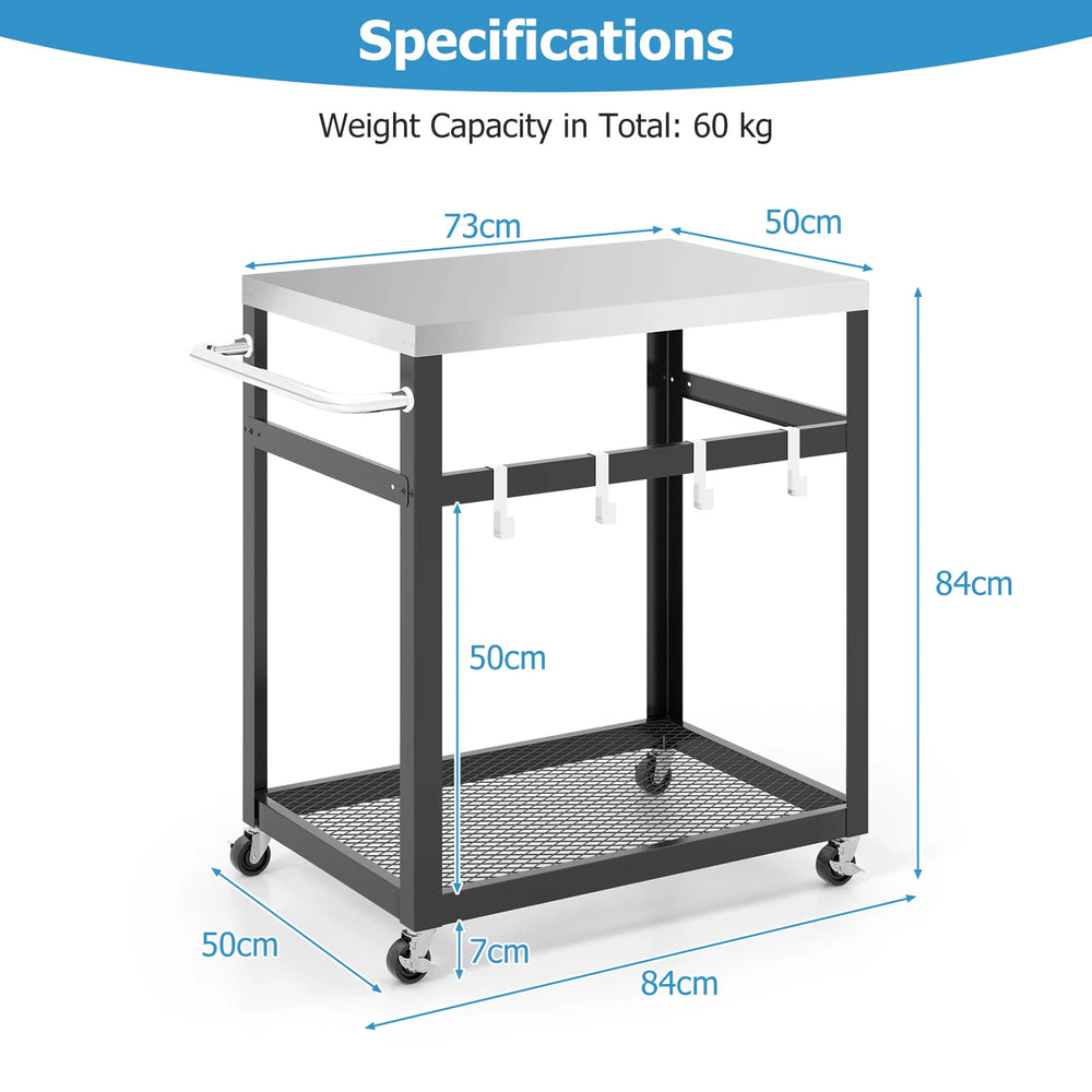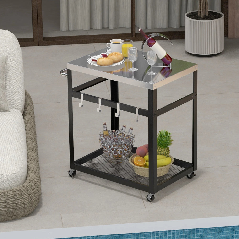 2-Tier Stainless Steel Grill Cart with 4 Hooks and Wheels BBQ Table-Black